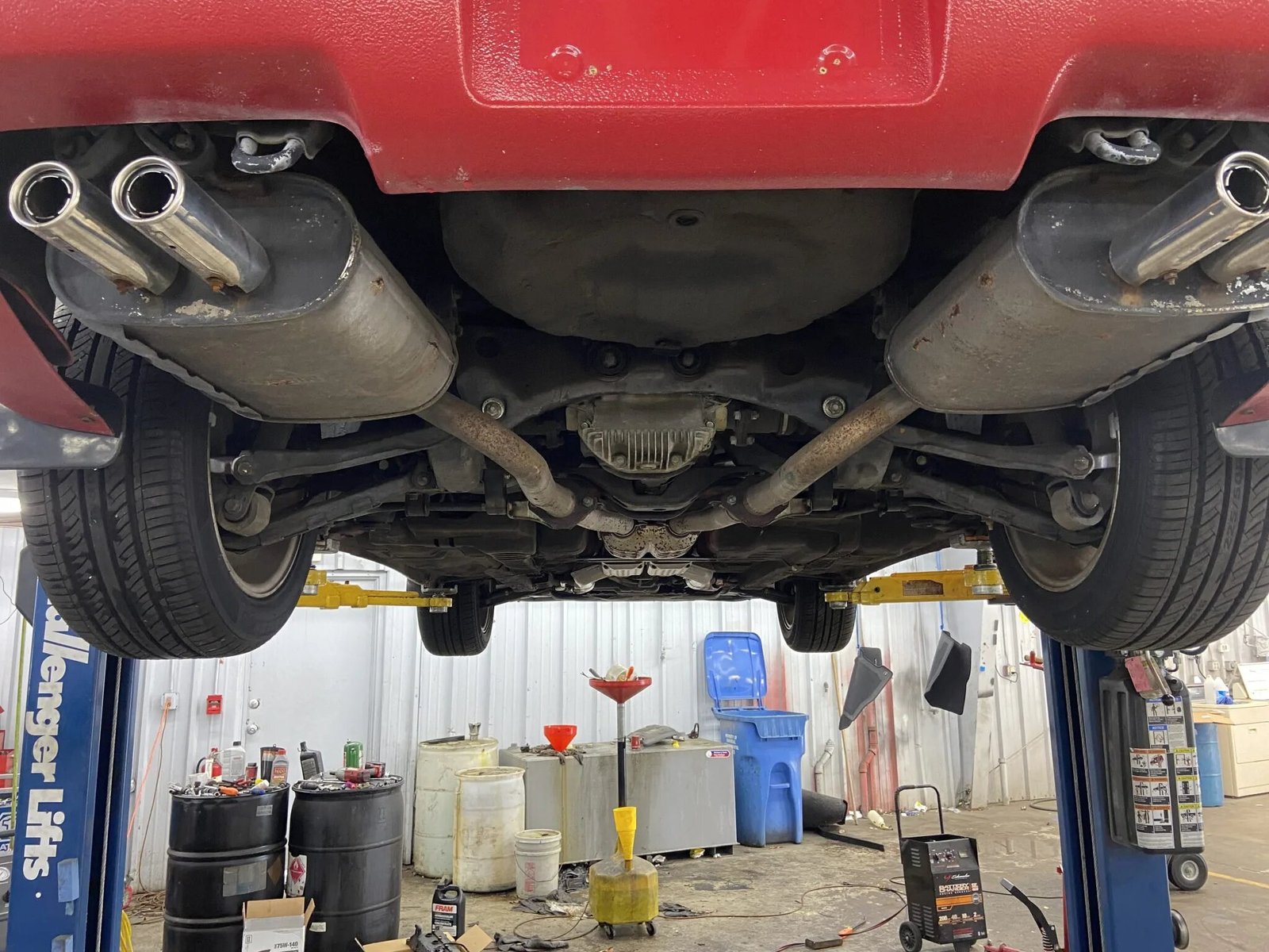 The car is finished in Aztec Red (AG2) and features removable glass T-top panels, integrated fog lights, a rear windshield wiper, and quadruple exhaust outlets.
