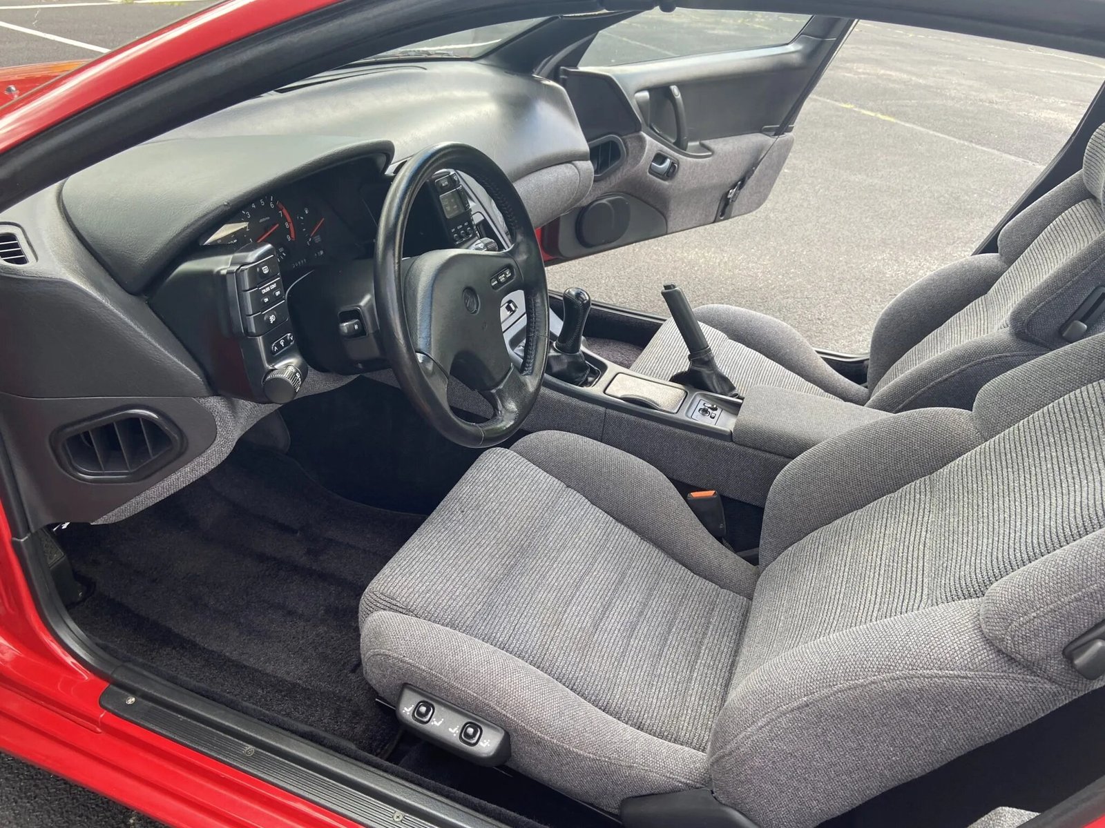 The cabin features bolstered bucket seats trimmed in gray cloth, and color-coordinated upholstery extends to the lower dashboard and door panels.