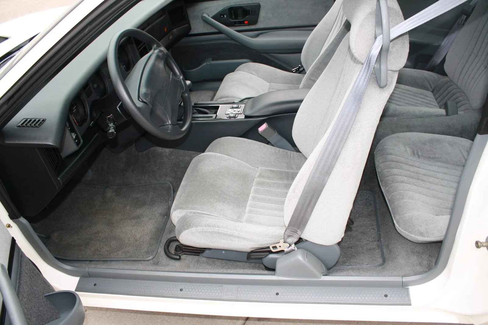 The cabin features seating upholstered in gray cloth with matching carpets and contrasting black trim on the dashboard, center console, and door panels.