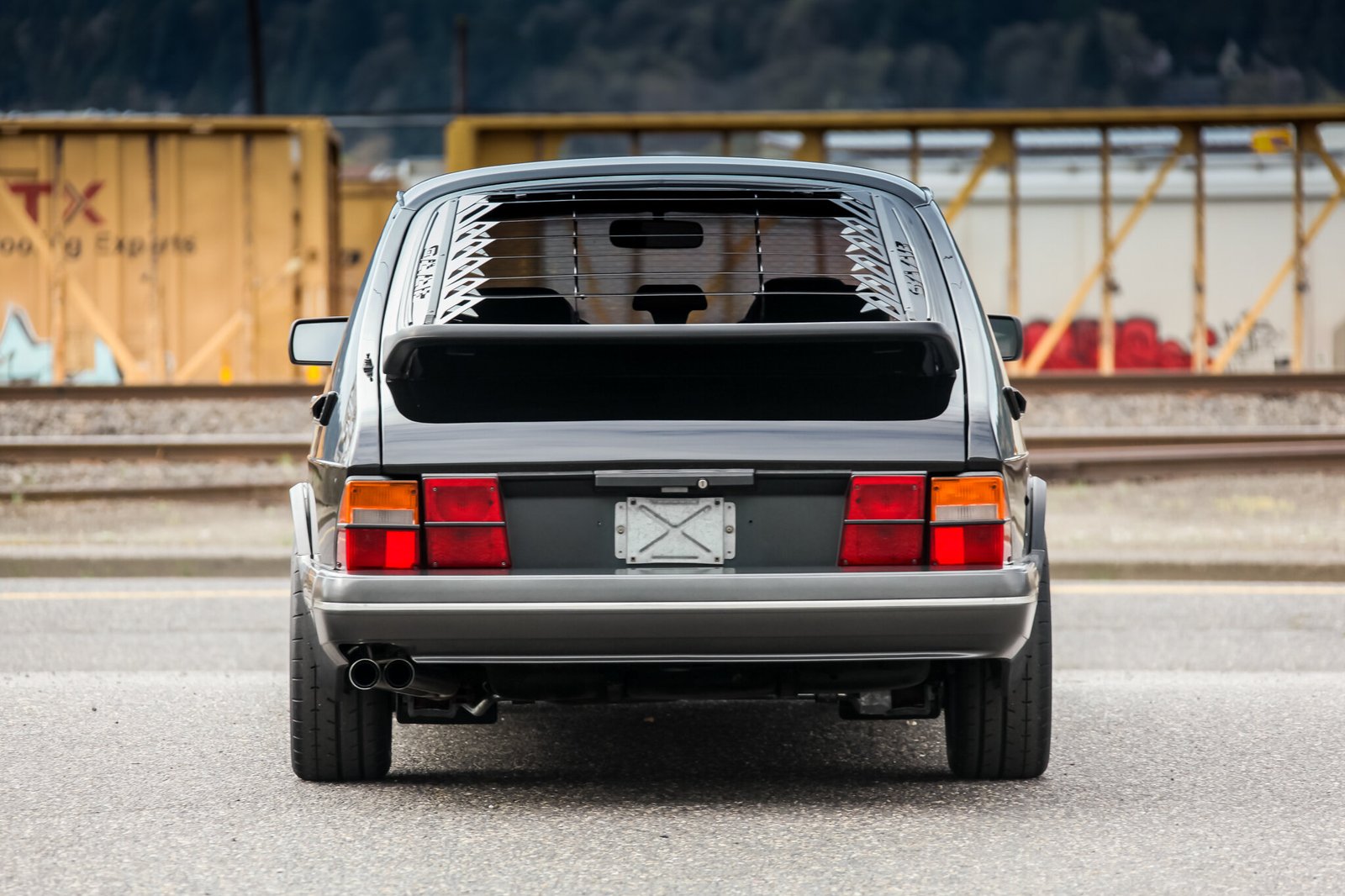 Equipment includes fog lights with guards, side vent covers, headlight wipers, a whale tail spoiler, and rear window louvers.