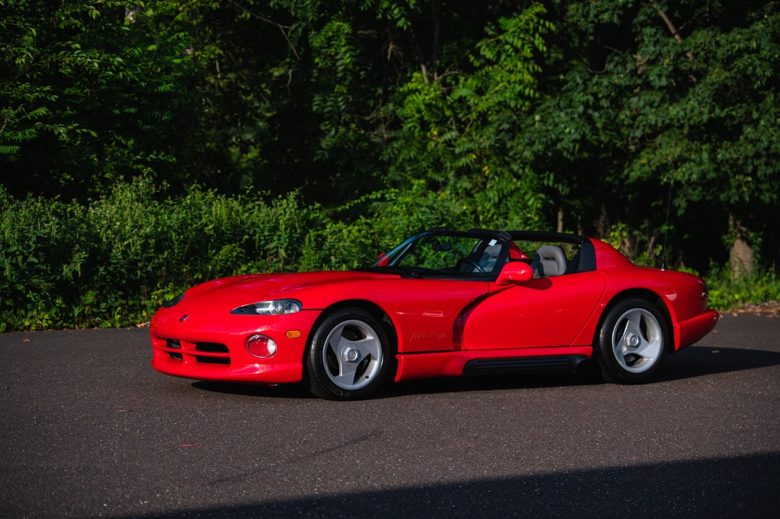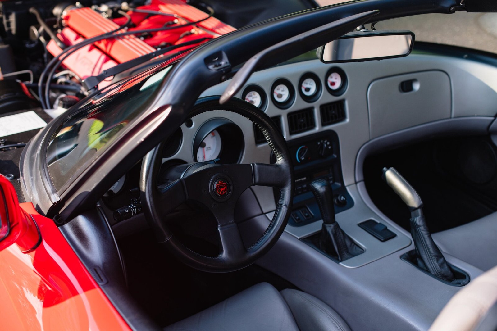The car is finished in Viper Red over gray leather and is powered by an 8.0-liter V10 paired with a six-speed manual transmission and a limited-slip differential.