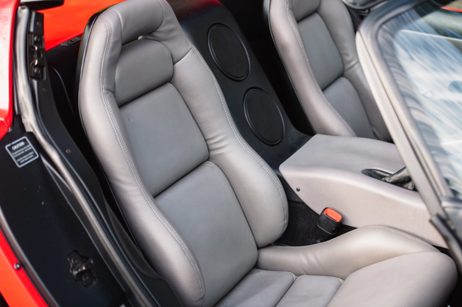 The leather-wrapped steering wheel frames a 180-mph speedometer and a tachometer with a 6k-rpm redline, and gauges for coolant temperature, oil pressure, fuel level, and voltage are centrally mounted in the dash.