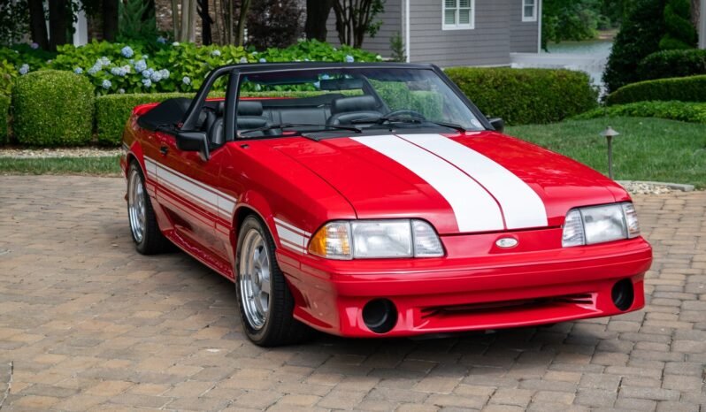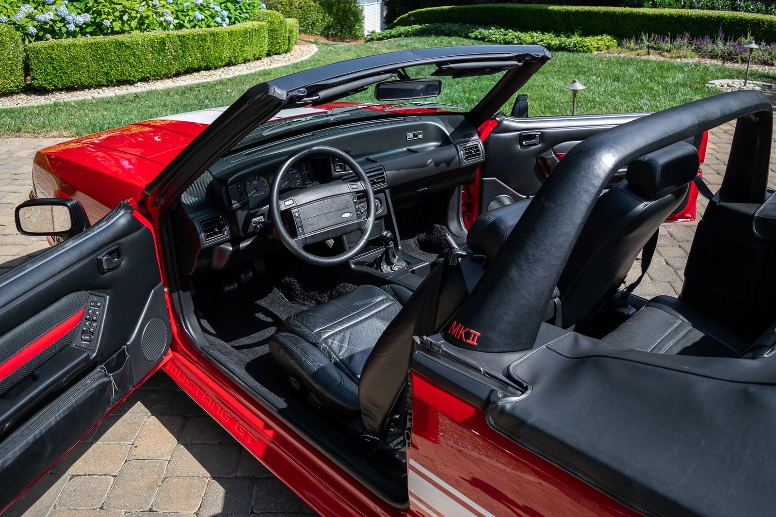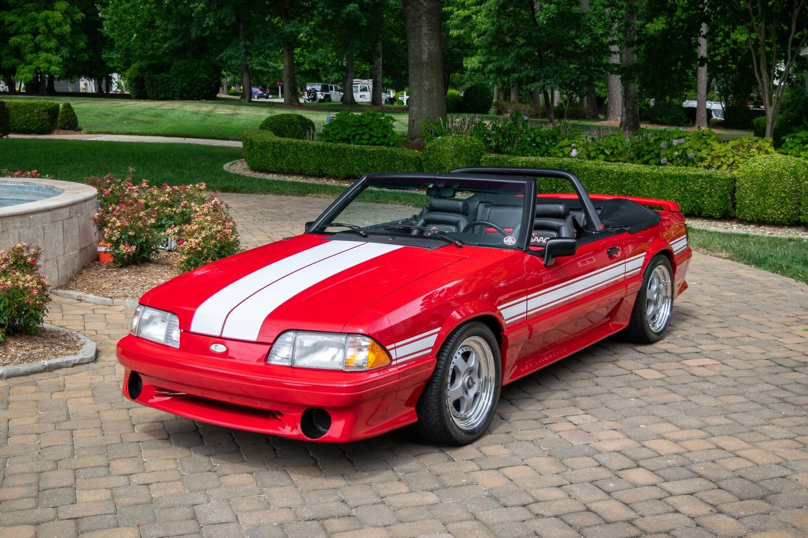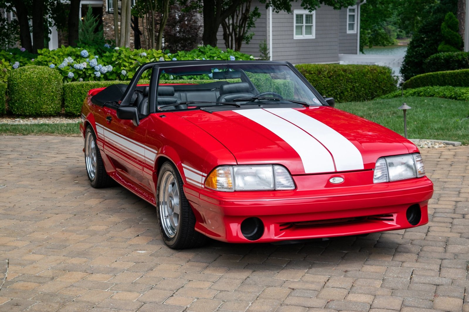 Finished in red with white stripes over a black leather interior, the car is powered by a 5.0-liter V8 with GT40 cylinder heads mated to a five-speed manual transmission and a Traction-Lok rear differential.