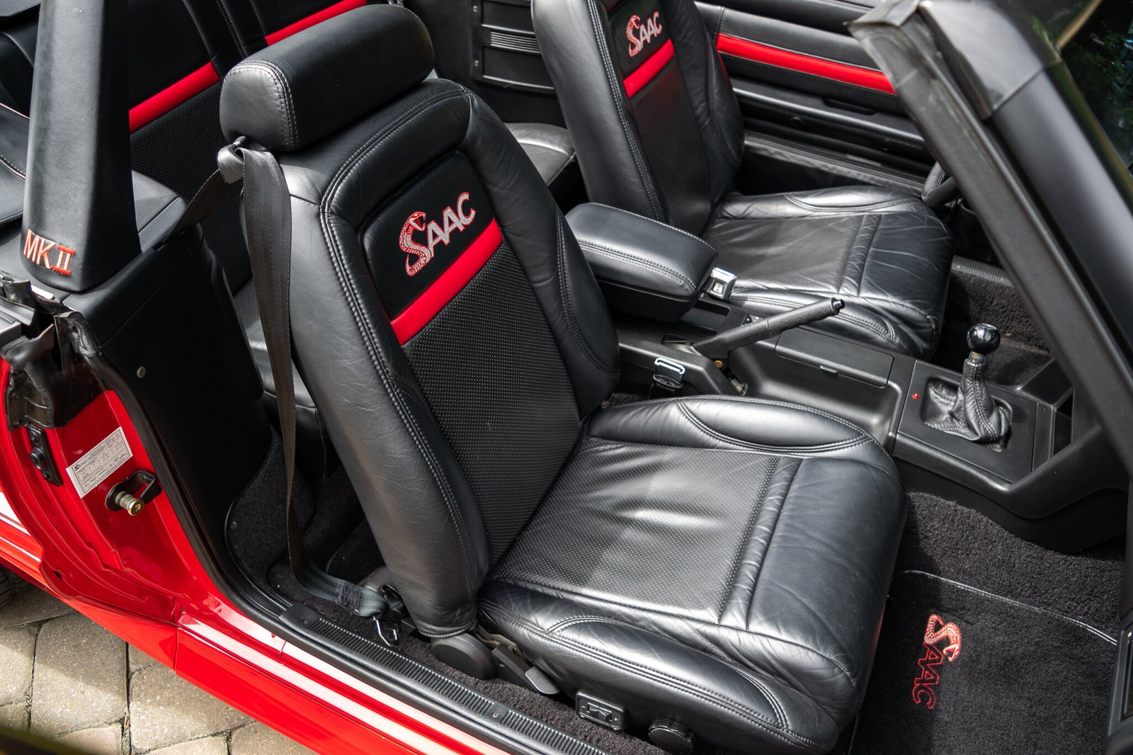 The front seats are upholstered in black leather with perforated inserts, red accents, and SAAC backrest embroidery.