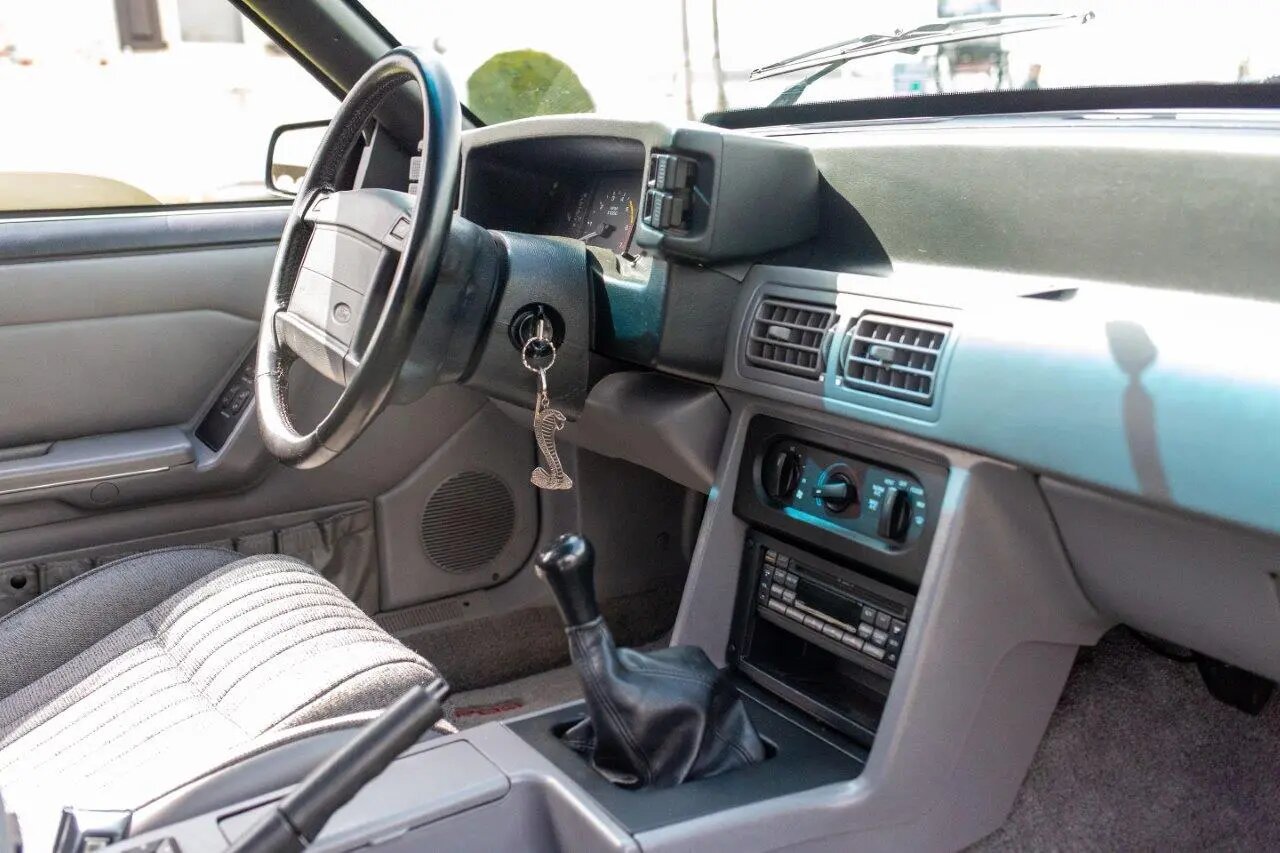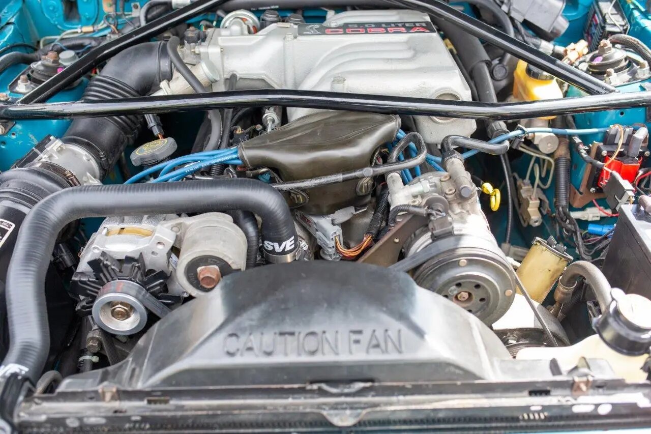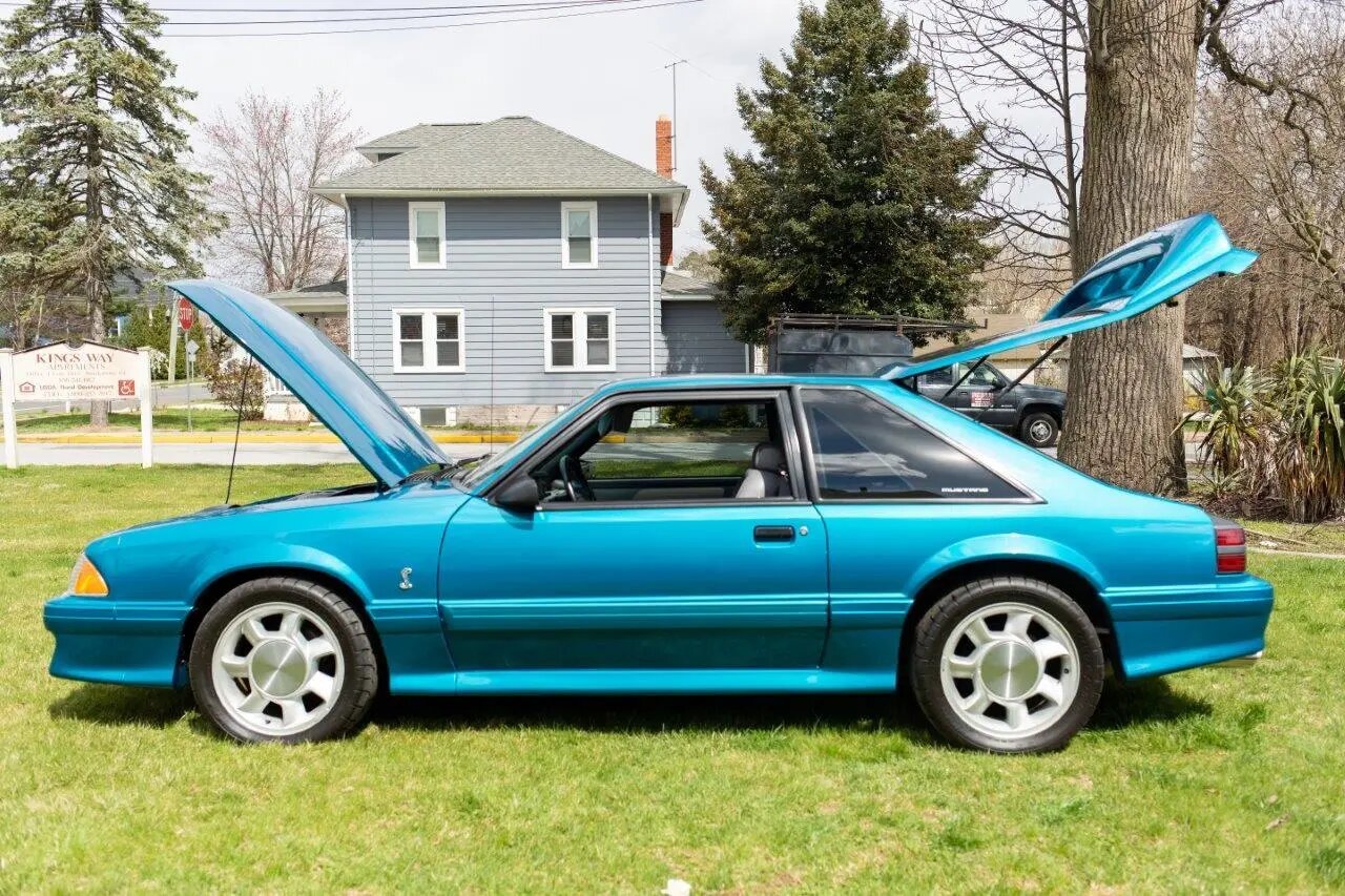 This 1993 Ford Mustang SVT Cobra is powered by a 5.0-liter V8 paired with a five-speed manual transmission and a Traction-Lok differential, and it is finished in Teal Metallic over gray cloth.