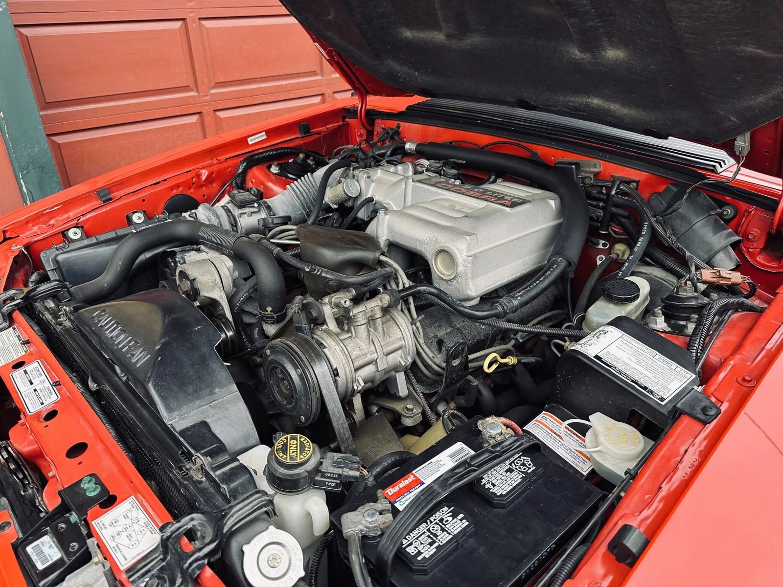 The 302ci OHV V8 features a Cobra-specific upper intake manifold and camshaft as well as a 65mm throttle body, GT40 cast-iron cylinder heads, and aluminum roller rockers.