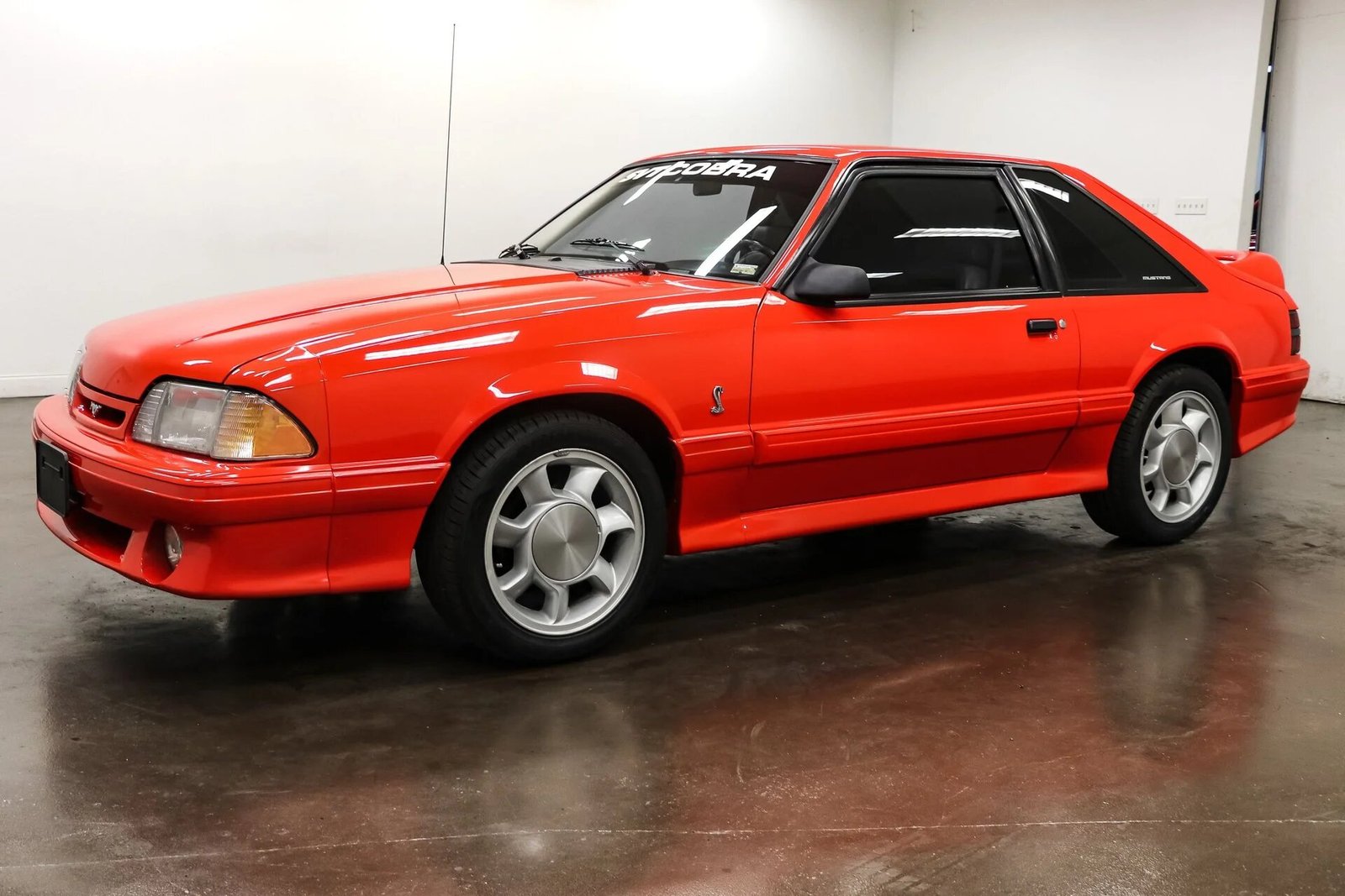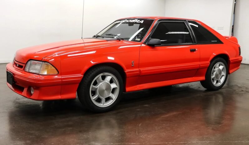 This 1993 Ford Mustang SVT Cobra is finished in Vibrant Red Clearcoat over Opal Grey leather, and power comes from a 5.0-liter V8 paired with a five-speed manual transmission and a Traction-Lok differential.