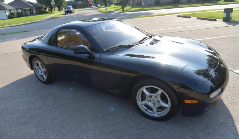 The car is powered by a twin-turbocharged 1.3-liter Wankel rotary mated to a five-speed manual transmission and is finished in black over tan leather upholstery.
