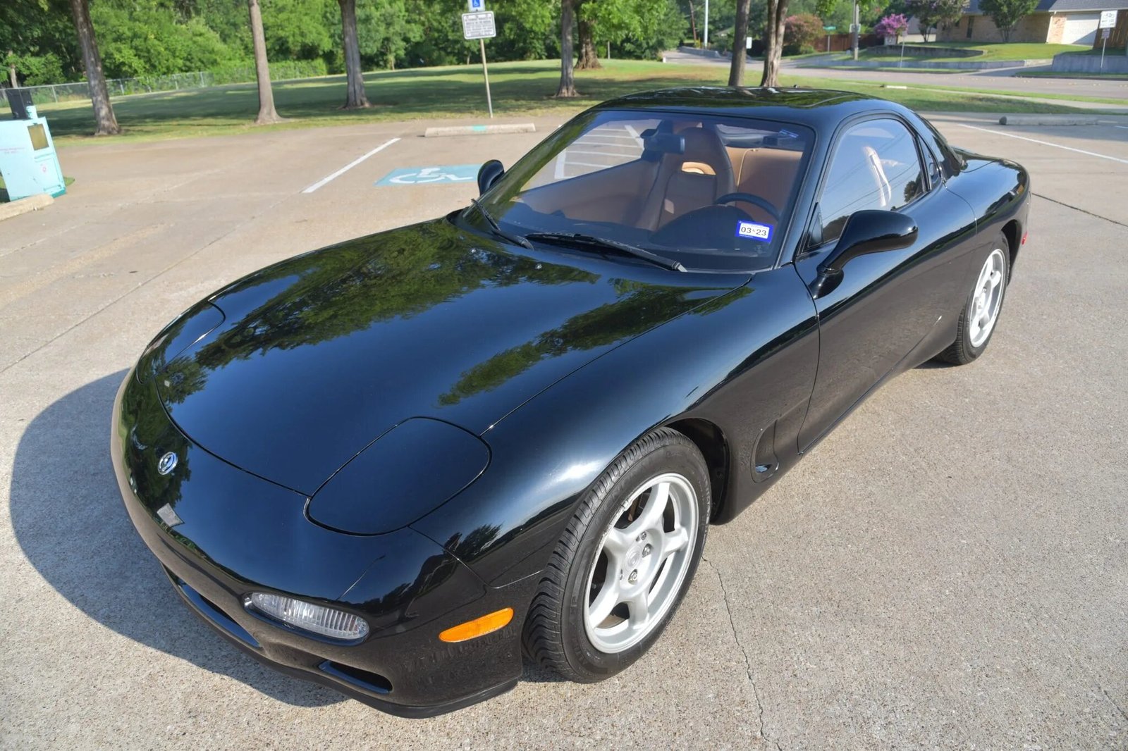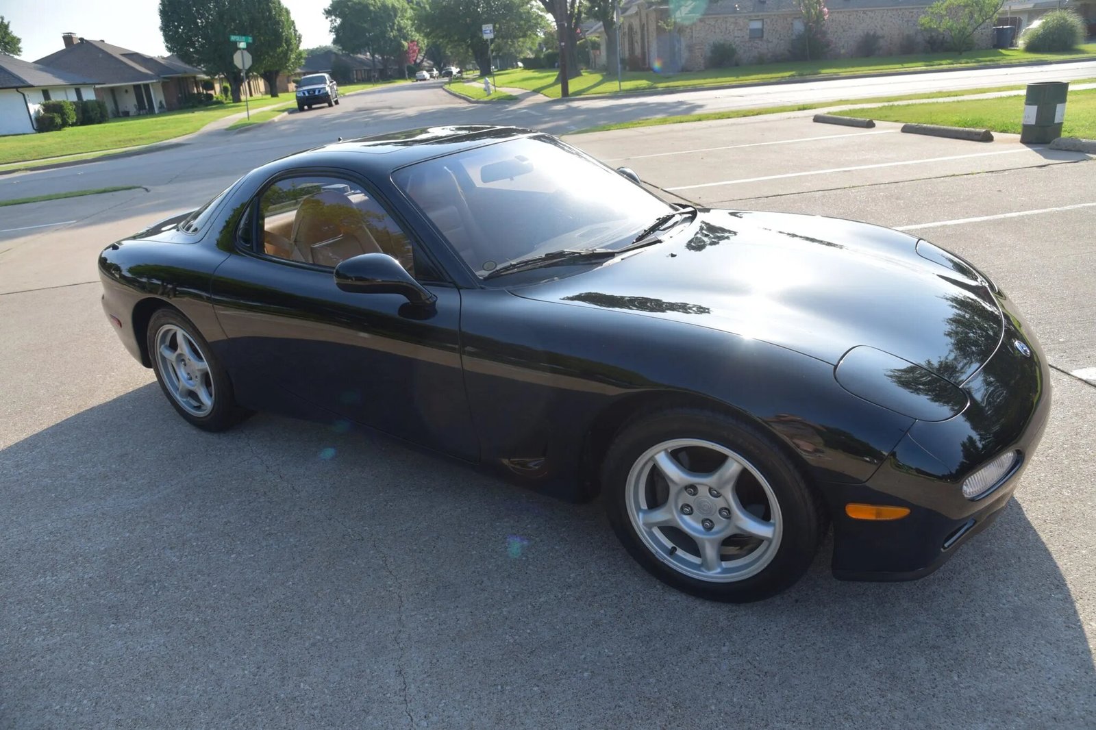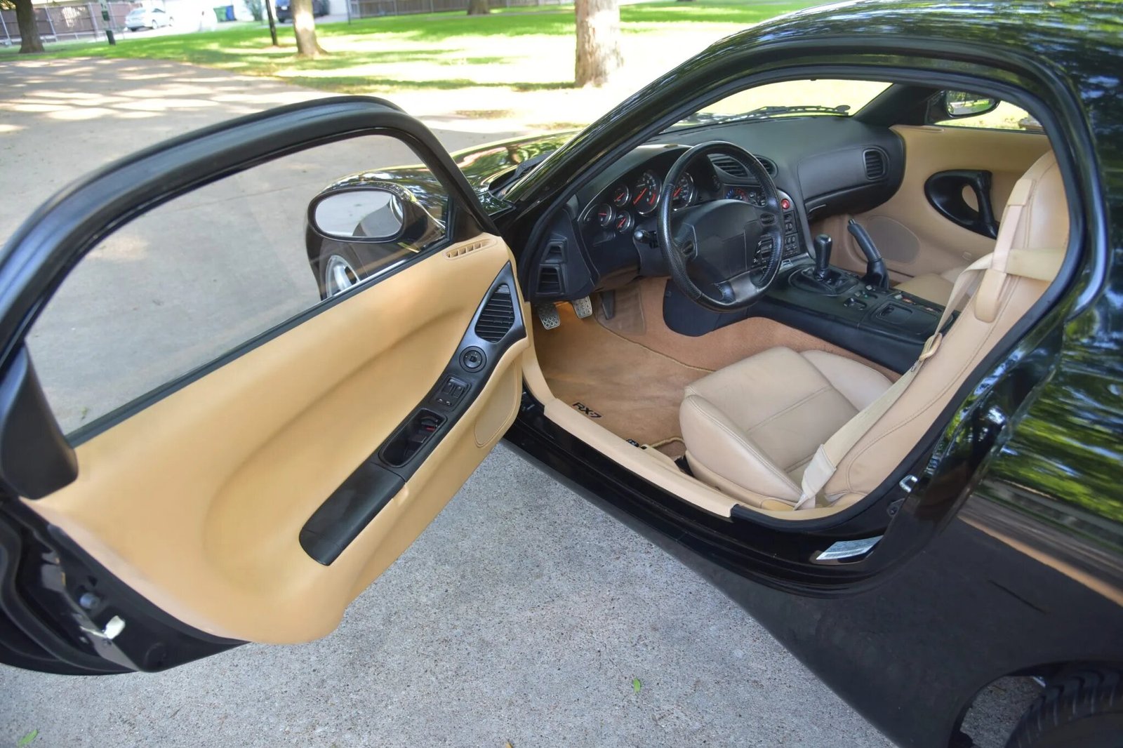 The cabin features bucket seats upholstered in tan leather, darker tan carpets, RX-7 embroidered floor mats, and a black dashboard and center console.