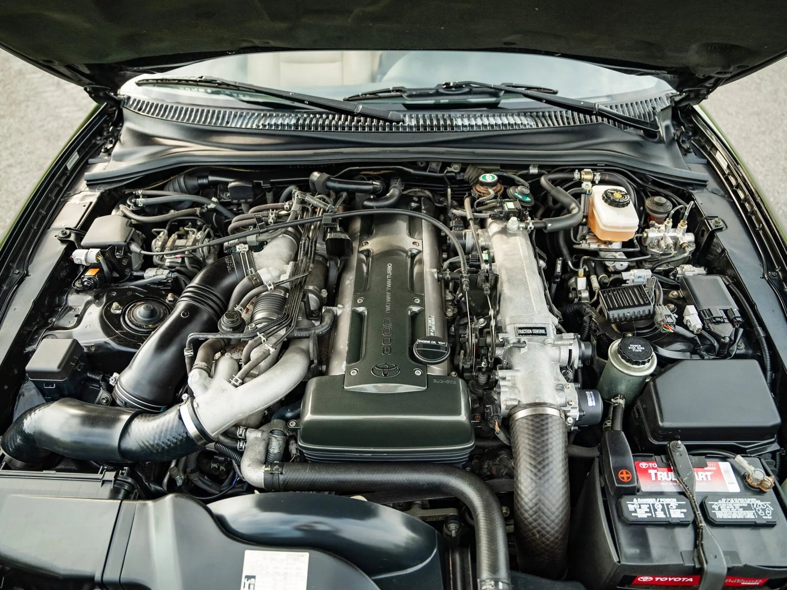 The twin-turbocharged and intercooled 3.0L 2JZ-GTE inline-six was factory rated at 320 horsepower and 315 lb-ft of torque. Service in February 2024 included changing the oil, flushing the coolant, and replacing the timing belt, water pump, thermostat, drive belt, spark plugs, PCV valve, and fuel filter. Power is routed to the rear wheels via a six-speed manual transmission and a Torsen limited-slip differential, both of which received fluid changes in preparation for sale.