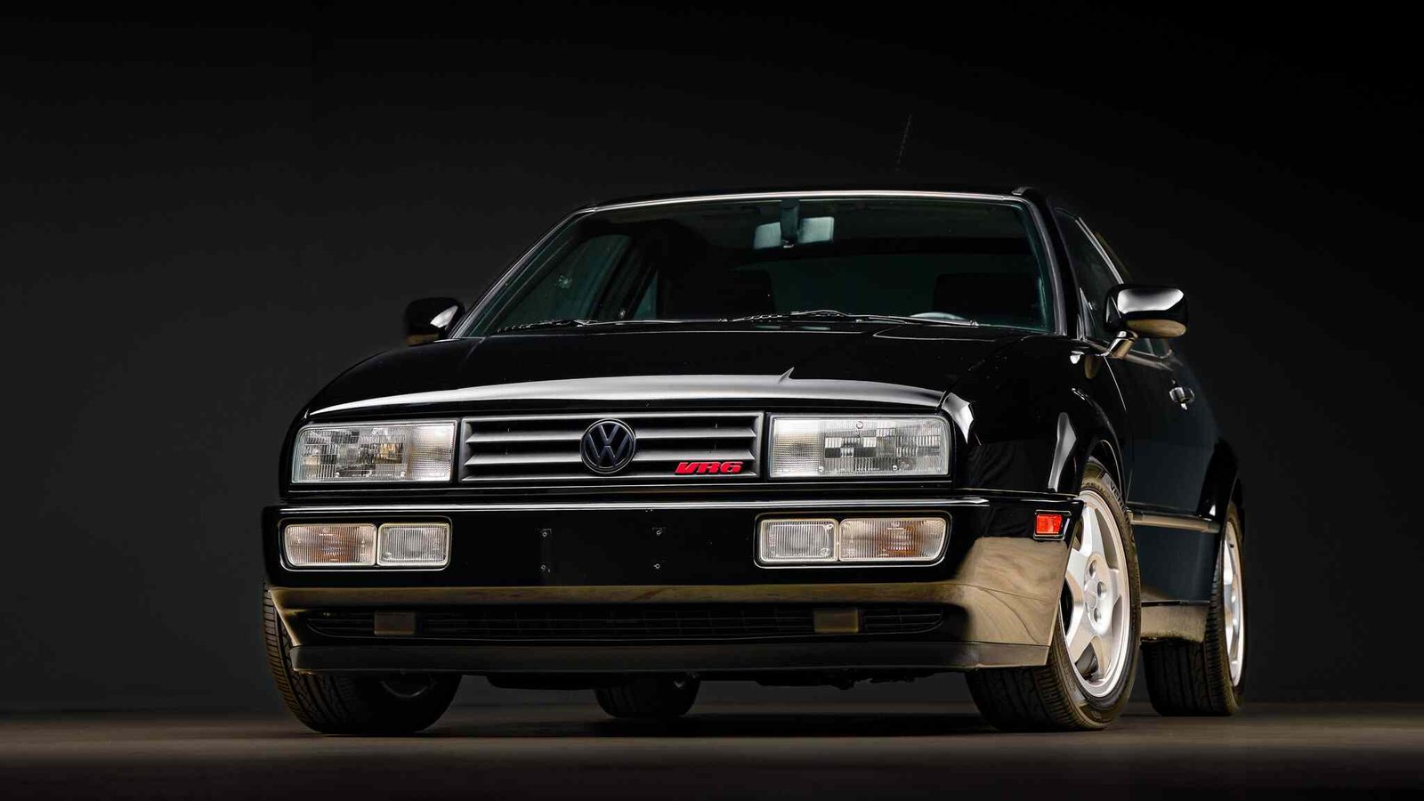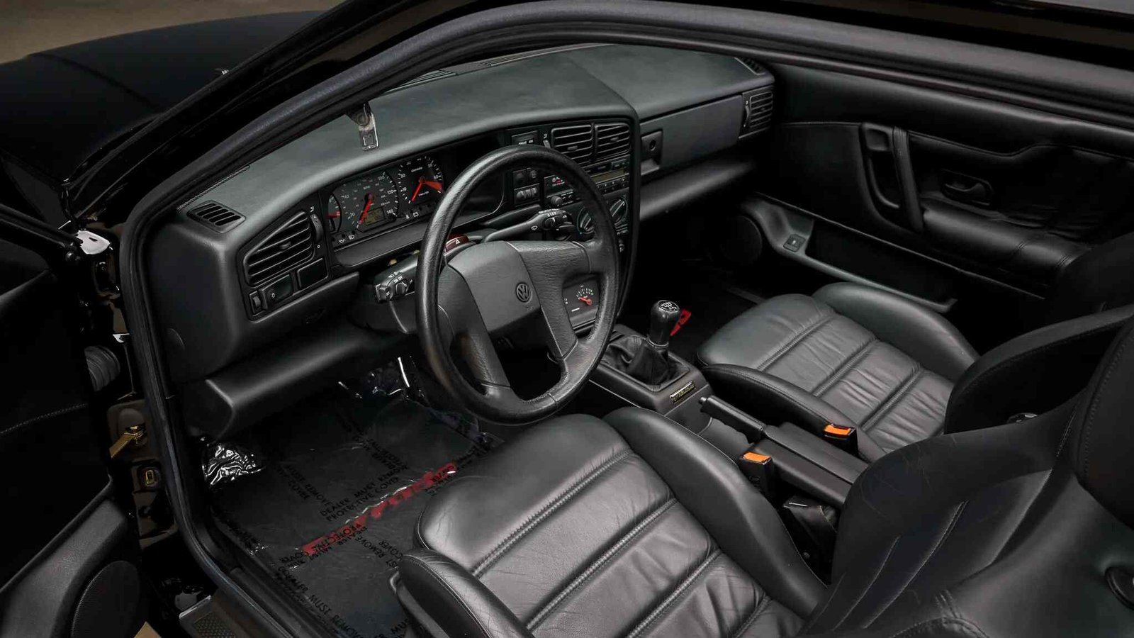 The heated front seats and folding rear seats are upholstered in black leather, and cabin appointments include cruise control, automatic front seatbelts, Corrado-branded floor mats, power windows, air conditioning, and a cassette stereo.