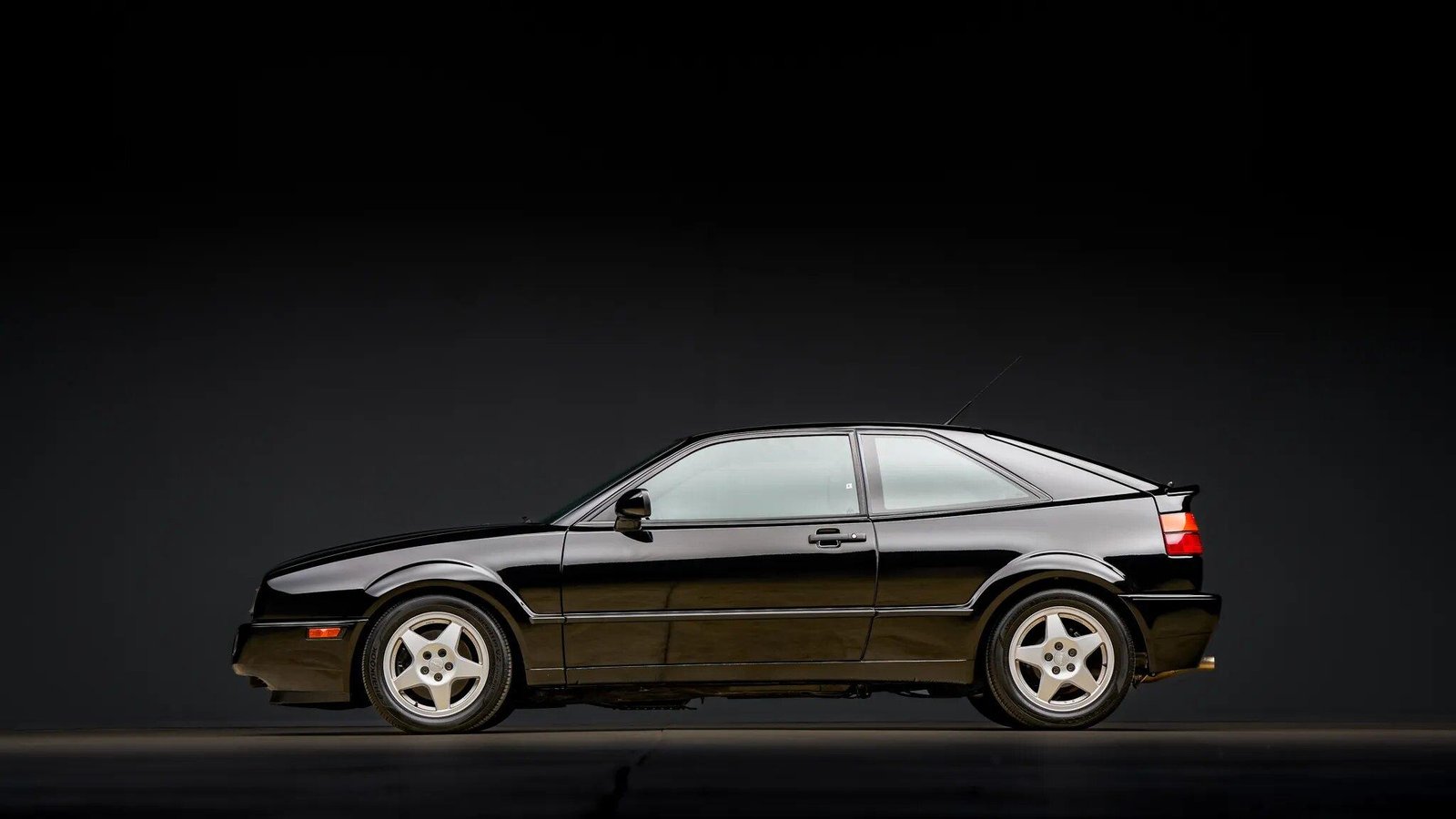 This 1993 Volkswagen Corrado SLC is a black-over-black coupe powered by a 2.8-liter VR6 paired with a five-speed manual transaxle. The car has been modified with height-adjustable coilover suspension and a stainless-steel exhaust system with a Borla muffler, and it is also equipped with 15″ Speedline wheels, a sunroof, fog lights, an active rear spoiler, four-wheel disc brakes, heated front seats, power windows, and an AM/FM cassette stereo.