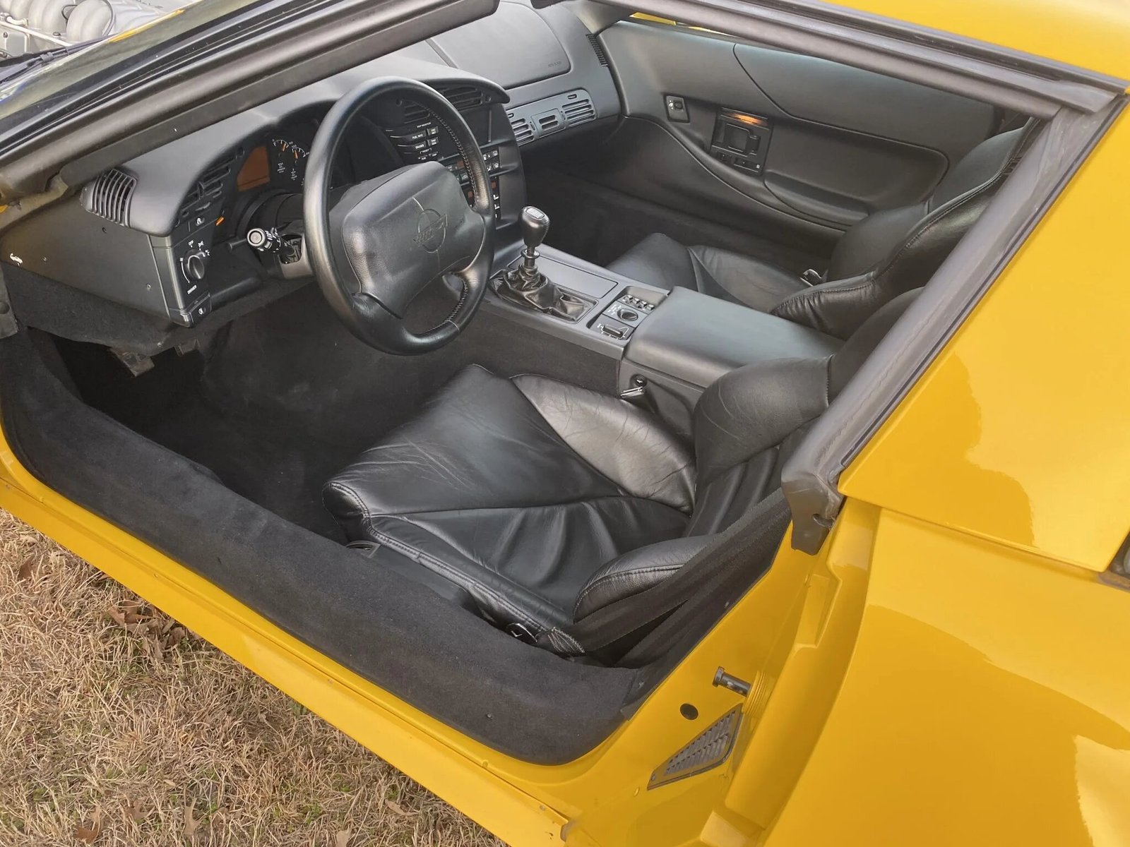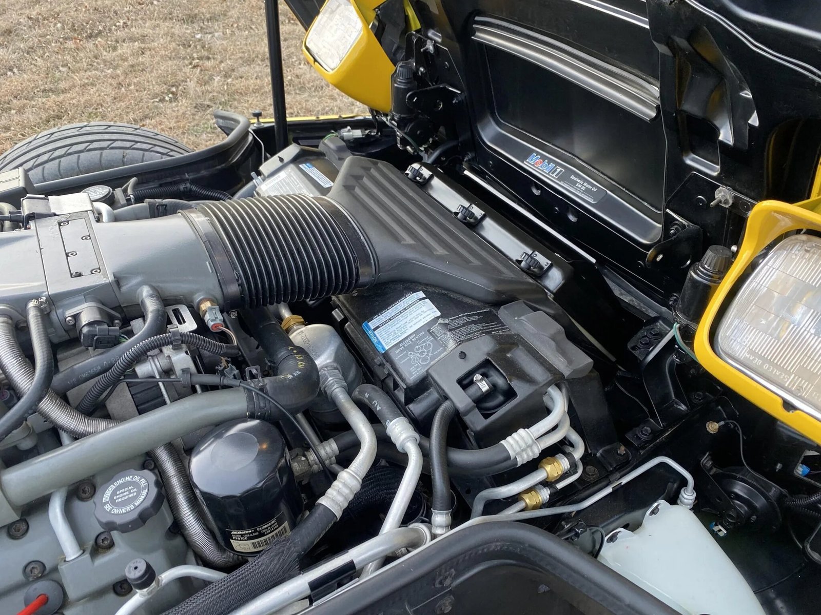 This example is finished in Competition Yellow and features pop-up headlights, fog lamps, a removable fiberglass roof panel, a removable transparent roof panel, fender aero-vents, and power-adjustable and heated side mirrors.