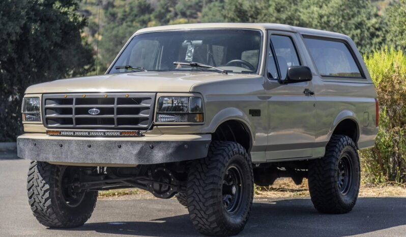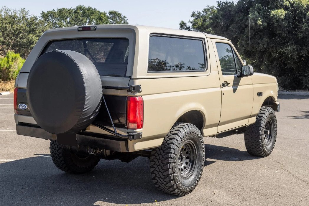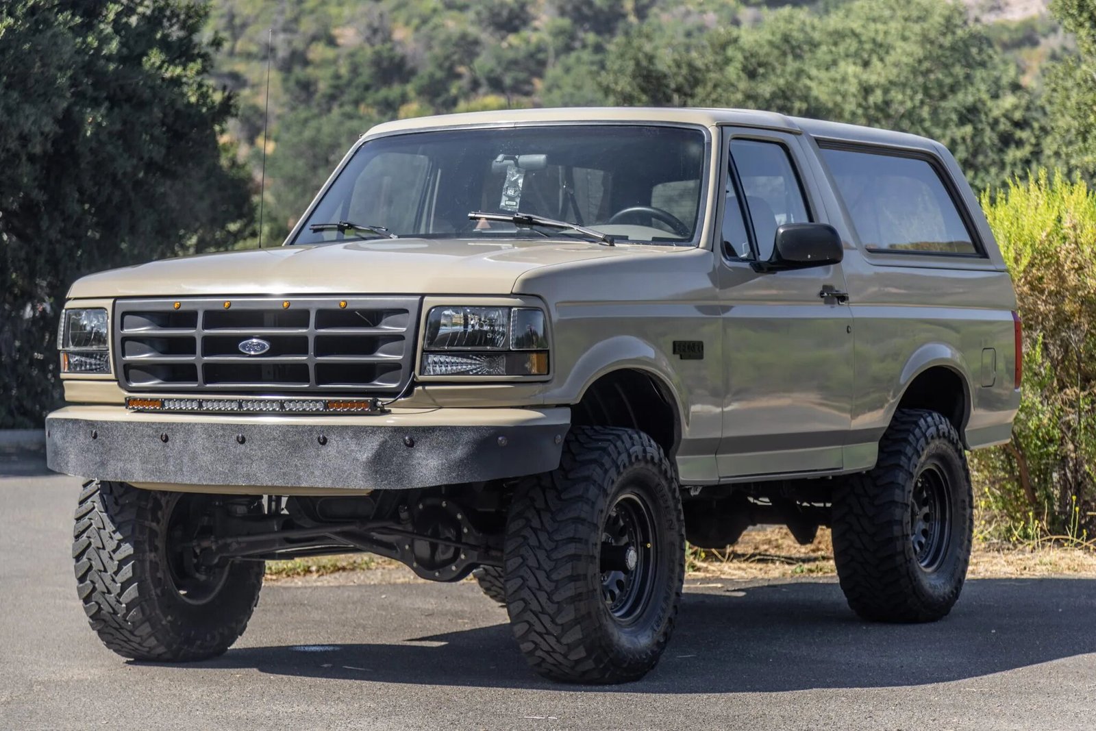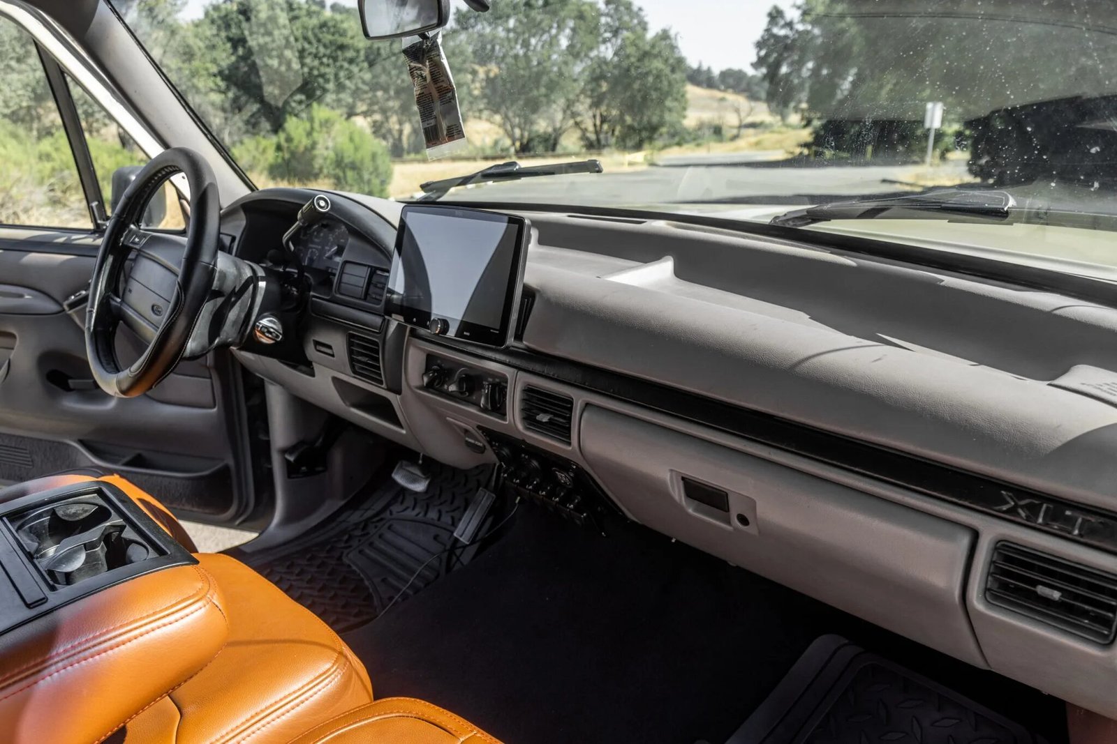 The interior features power-adjustable front seats that have been reupholstered in brown leather with Bronco logos embroidered in the headrests.