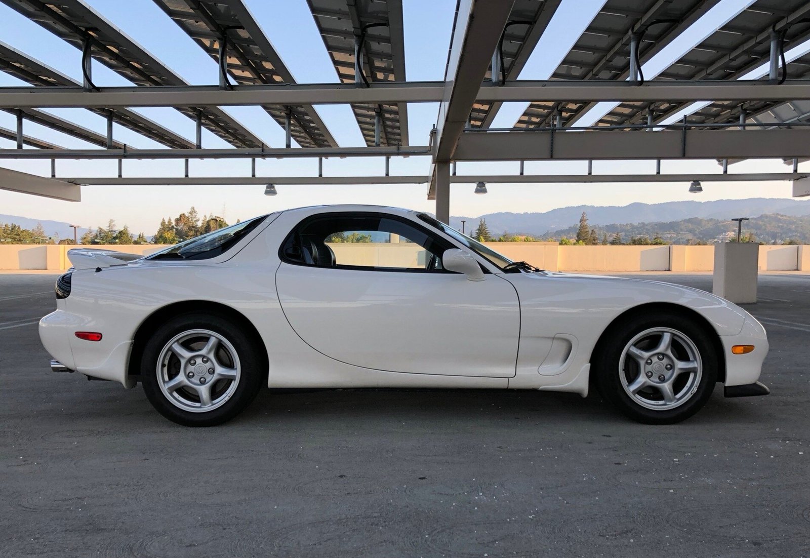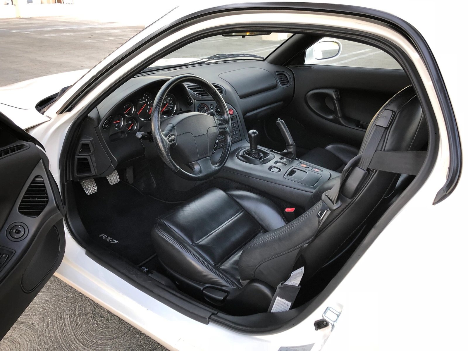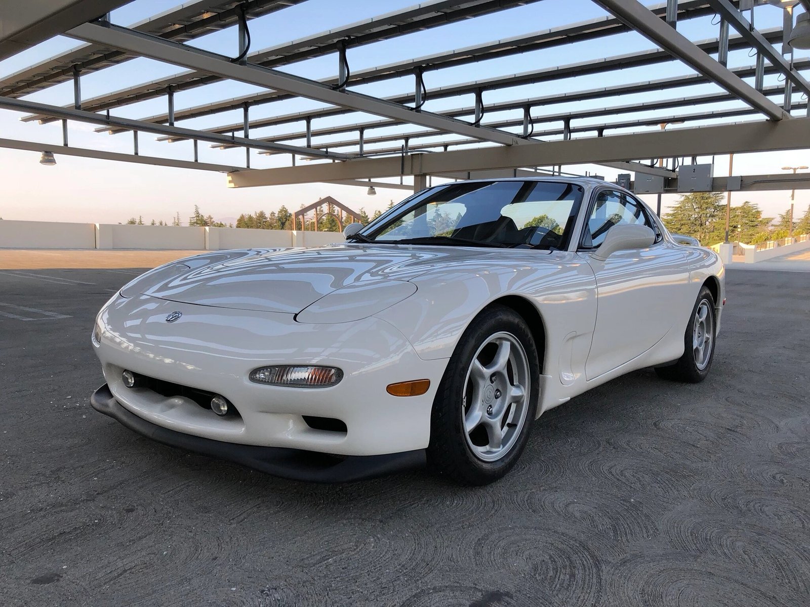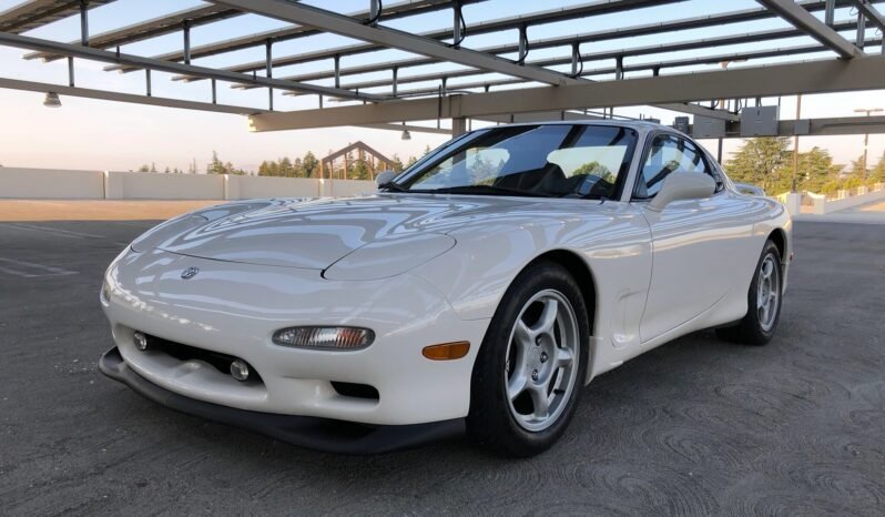 This 1994 Mazda RX-7 Touring is finished in white over black leather, power comes from a sequentially-turbocharged 1.3L rotary paired with a 5-speed manual transmission, and modifications are limited to an HKS downpipe replacing the warm-up converter and a lower-temperature fan switch.