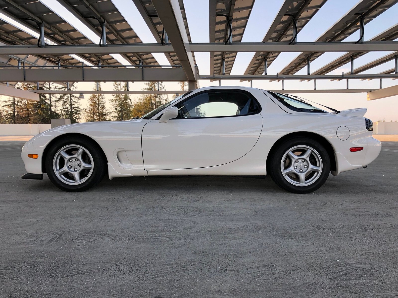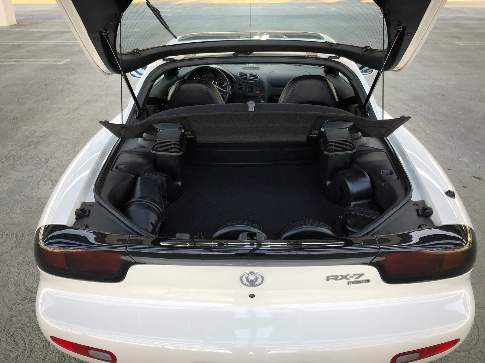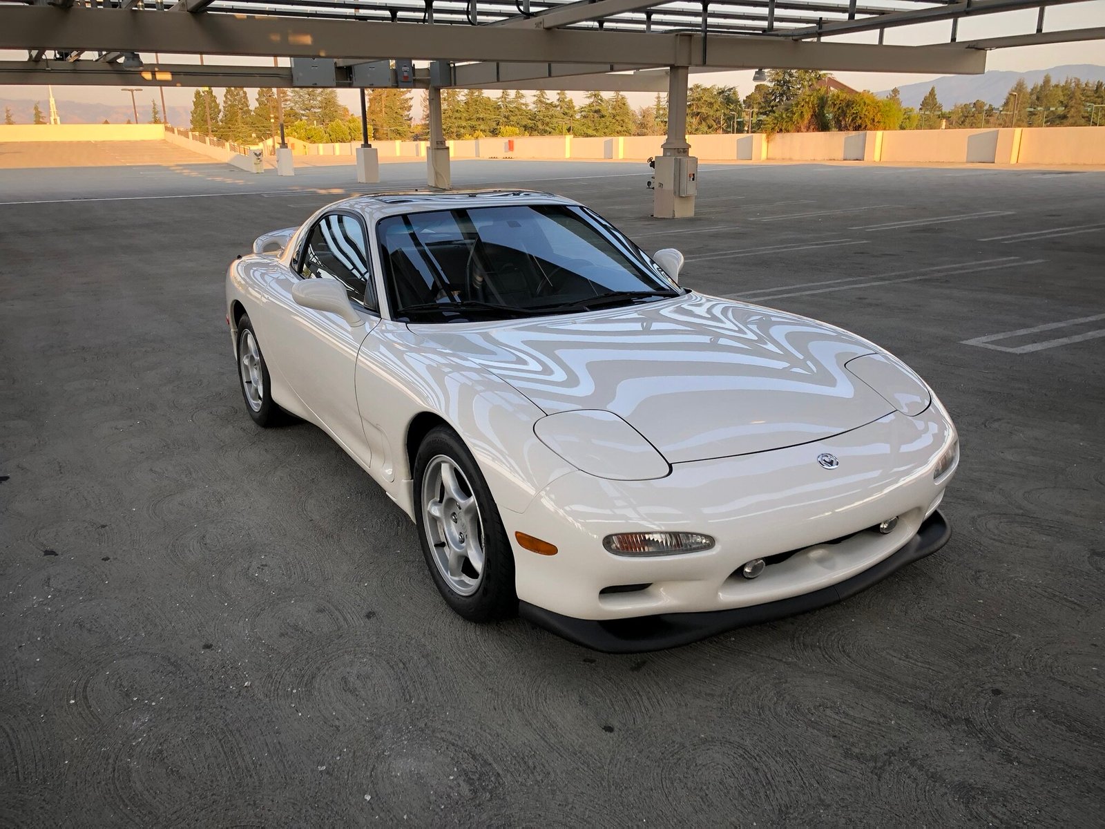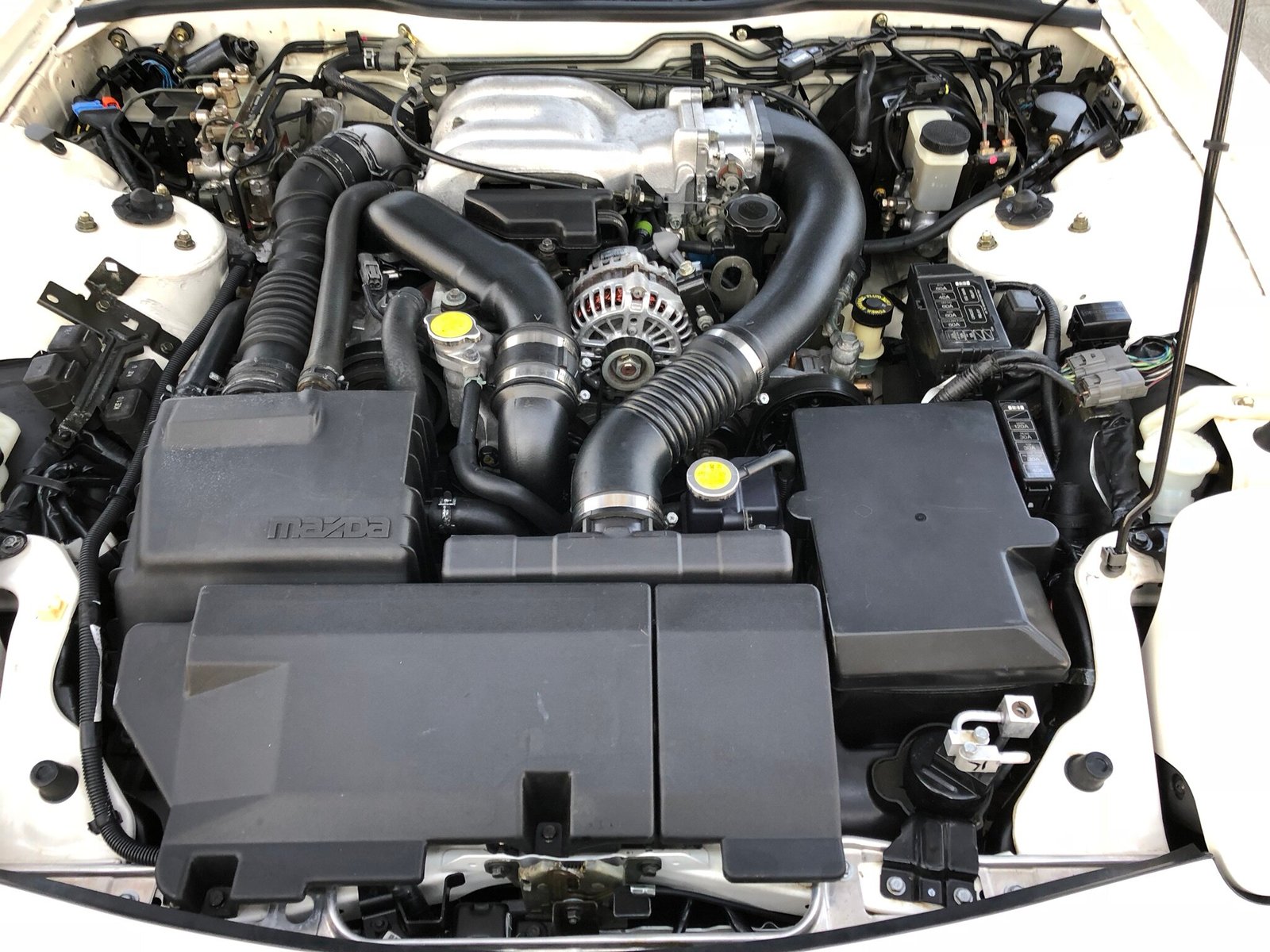 This 1994 Mazda RX-7 Touring is finished in white over black leather, power comes from a sequentially-turbocharged 1.3L rotary paired with a 5-speed manual transmission, and modifications are limited to an HKS downpipe replacing the warm-up converter and a lower-temperature fan switch.