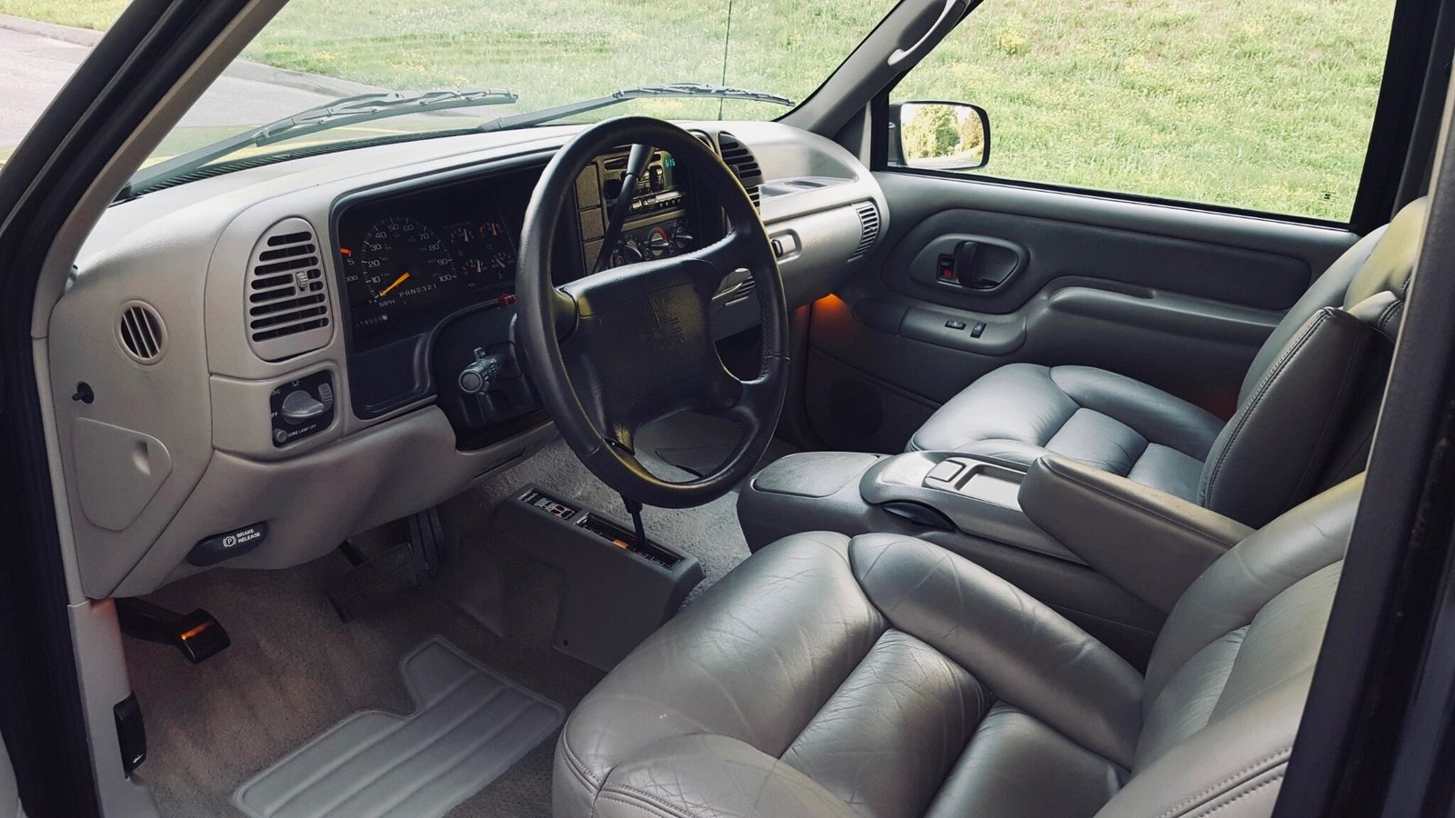 The cabin features grey leather upholstery and has also been kept stock, including the original Delco CD player.