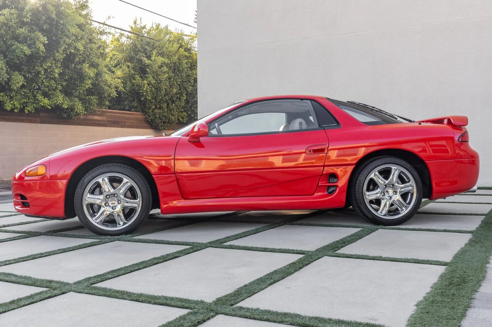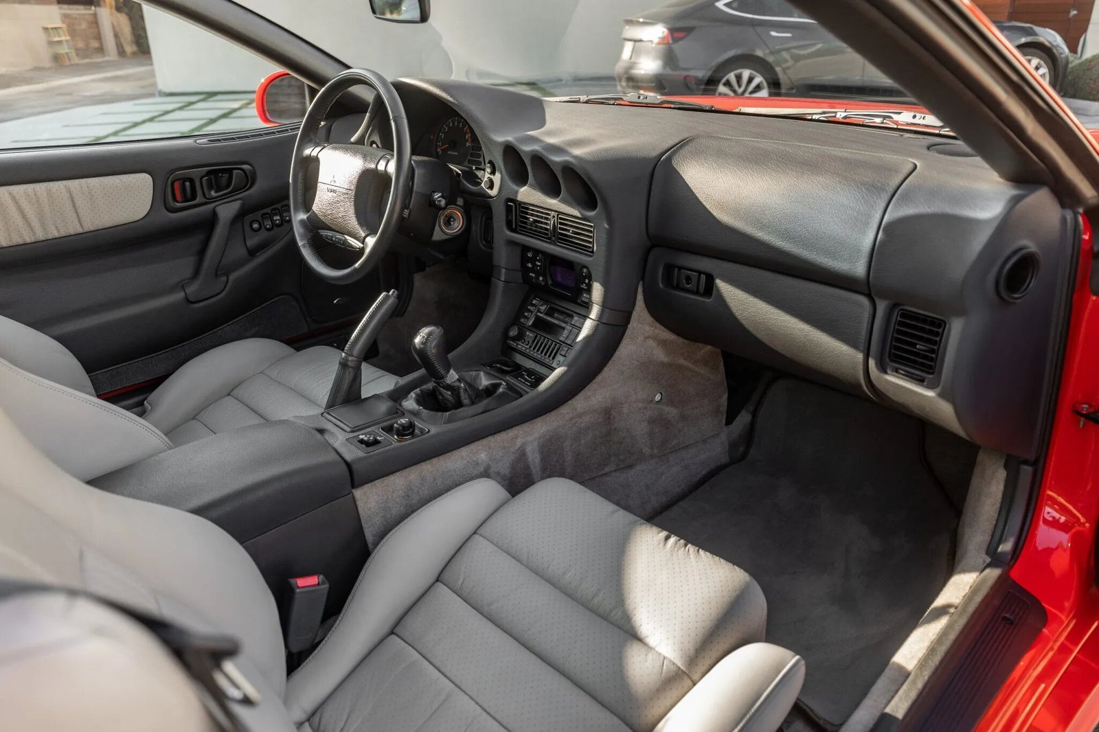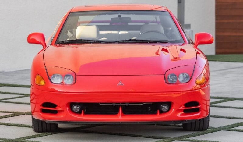 This 1995 Mitsubishi 3000GT VR-4 is finished in red over gray leather. Power is provided by a twin-turbocharged 3.0-liter V6 paired with a six-speed manual transaxle and an all-wheel-drive system. Equipment includes 18″ chrome wheels, four-wheel steering, a power-adjustable driver’s seat, automatic climate control, cruise control, and an Infinity cassette stereo with a CD changer.
