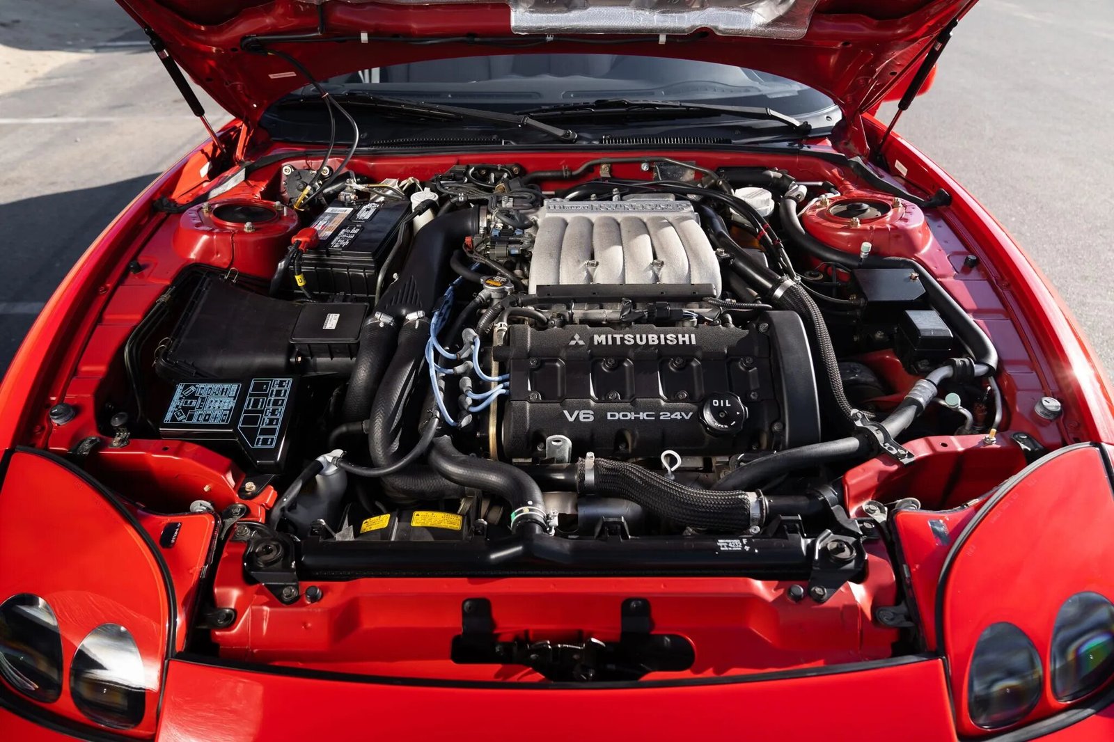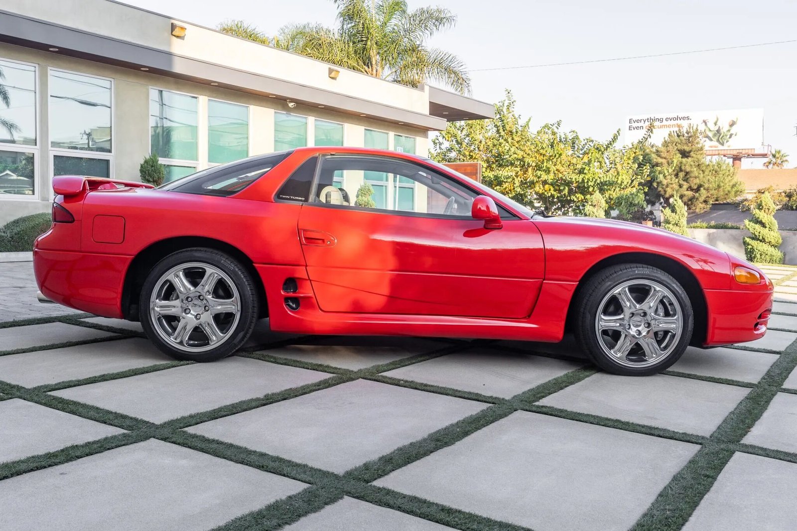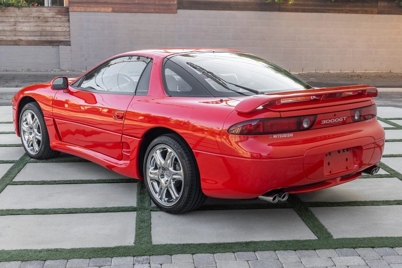 This 1995 Mitsubishi 3000GT VR-4 is finished in red over gray leather. Power is provided by a twin-turbocharged 3.0-liter V6 paired with a six-speed manual transaxle and an all-wheel-drive system. Equipment includes 18″ chrome wheels, four-wheel steering, a power-adjustable driver’s seat, automatic climate control, cruise control, and an Infinity cassette stereo with a CD changer.