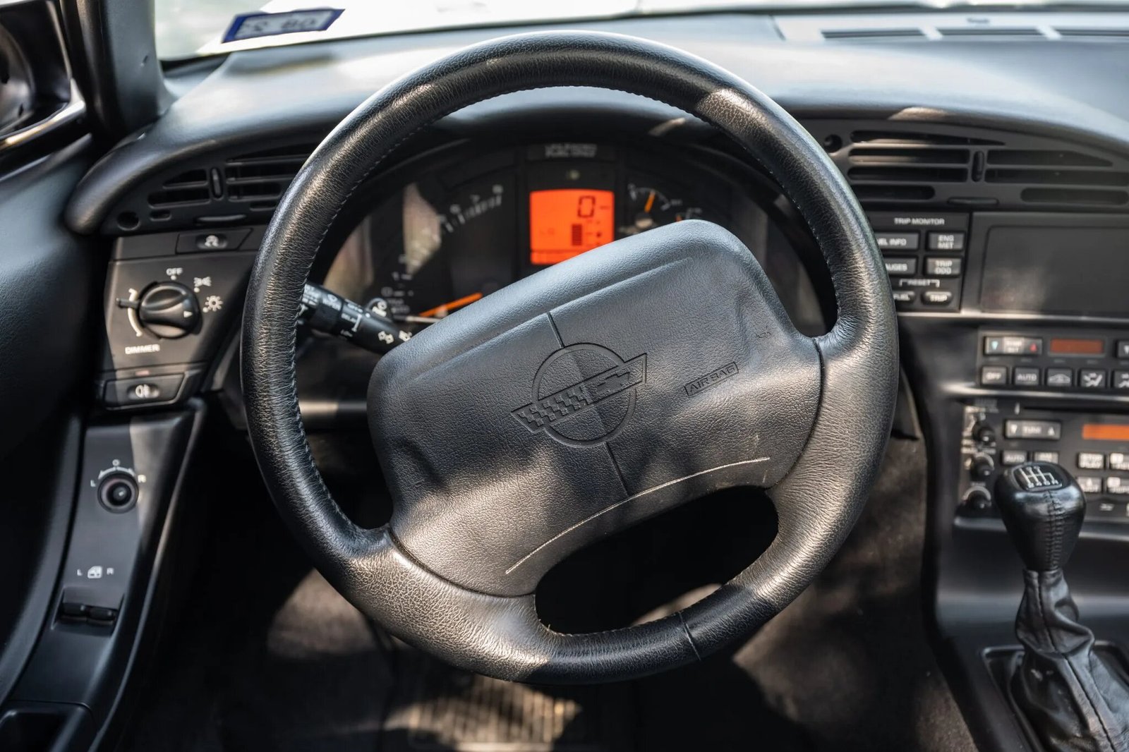 The leather-wrapped two-spoke steering wheel frames a central digital speedometer and fuel level monitor as well as analog instrumentation consisting of a tachometer with a 6,250-rpm redline and gauges for oil pressure, oil temperature, coolant temperature, and battery voltage.