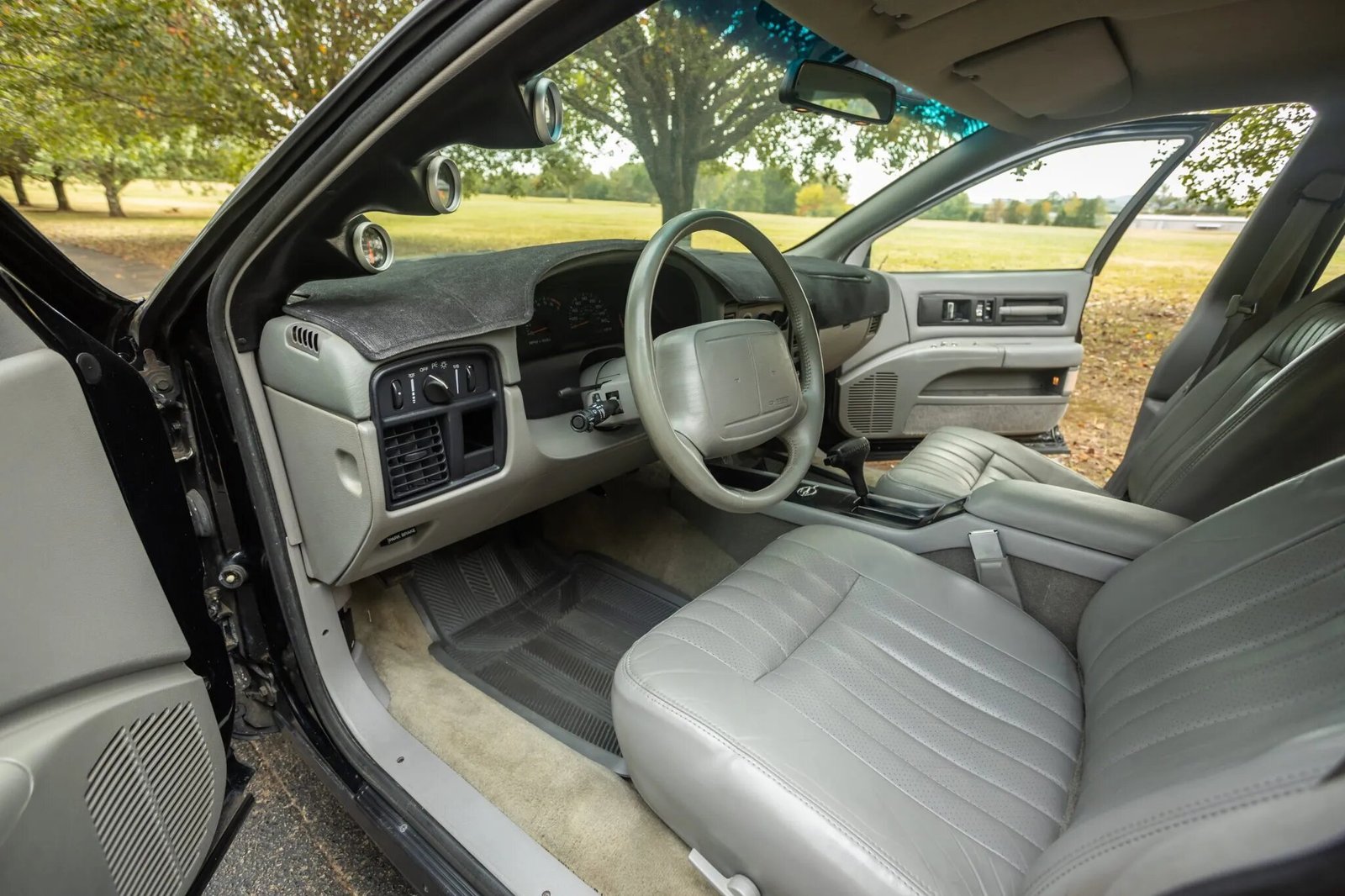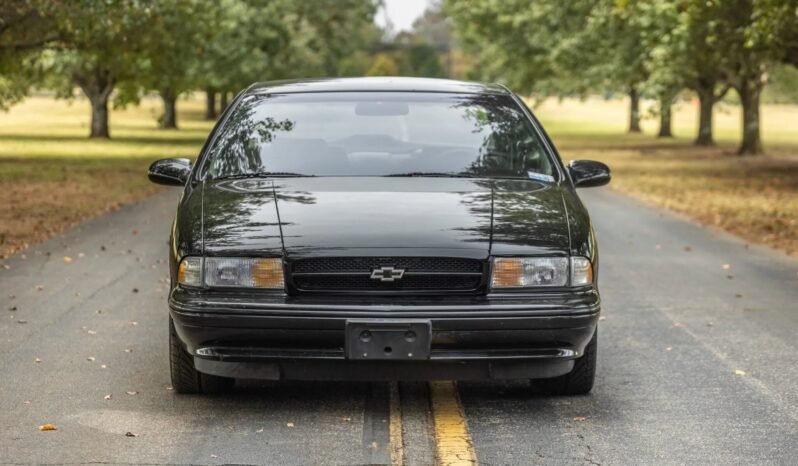 This 1996 Chevrolet Impala SS is powered by a 5.7-liter LT1 V8 paired with a four-speed automatic transmission and limited-slip differential, and it is finished in black over gray leather. Equipment includes 17″ five-spoke alloy wheels, a cold-air intake, a receiver hitch, power-adjustable front seats, dashboard and parcel-shelf covers, cruise control, and air conditioning.