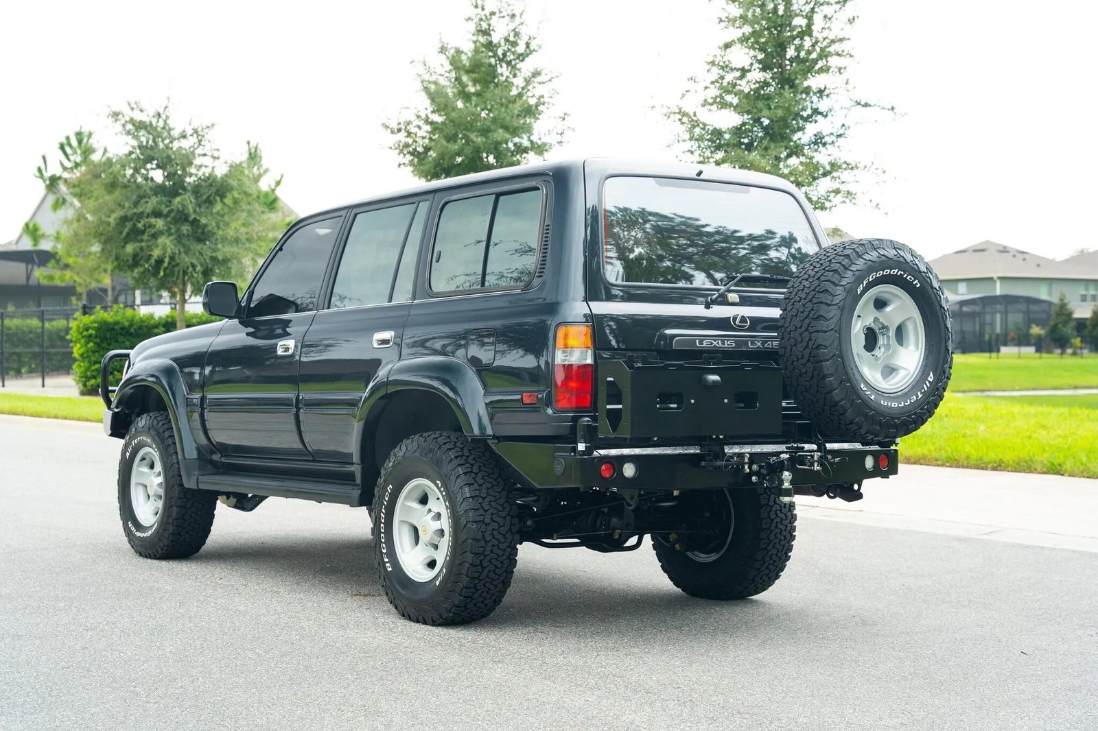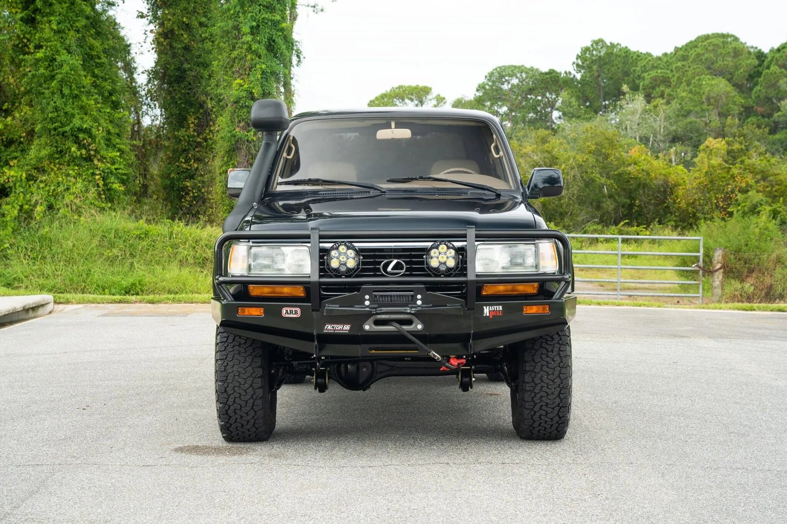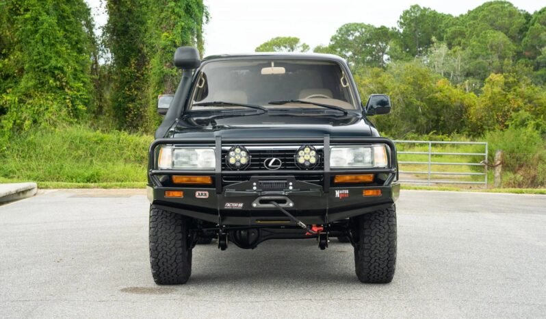This 1996 Lexus LX450 is powered by a 4.5-liter inline-six linked with a four-speed automatic transmission, a dual-range transfer case, and TJM front and rear locking differentials. Finished in Dark Emerald Pearl over Ivory leather, it is equipped with a Smittybilt winch, a Safari snorkel, a front brush guard, a rear storage box, a swing-away rear tire carrier, fabricated bumpers, 16″ five-spoke alloy wheels, automatic climate control, and a cassette stereo with a six-disc CD changer.