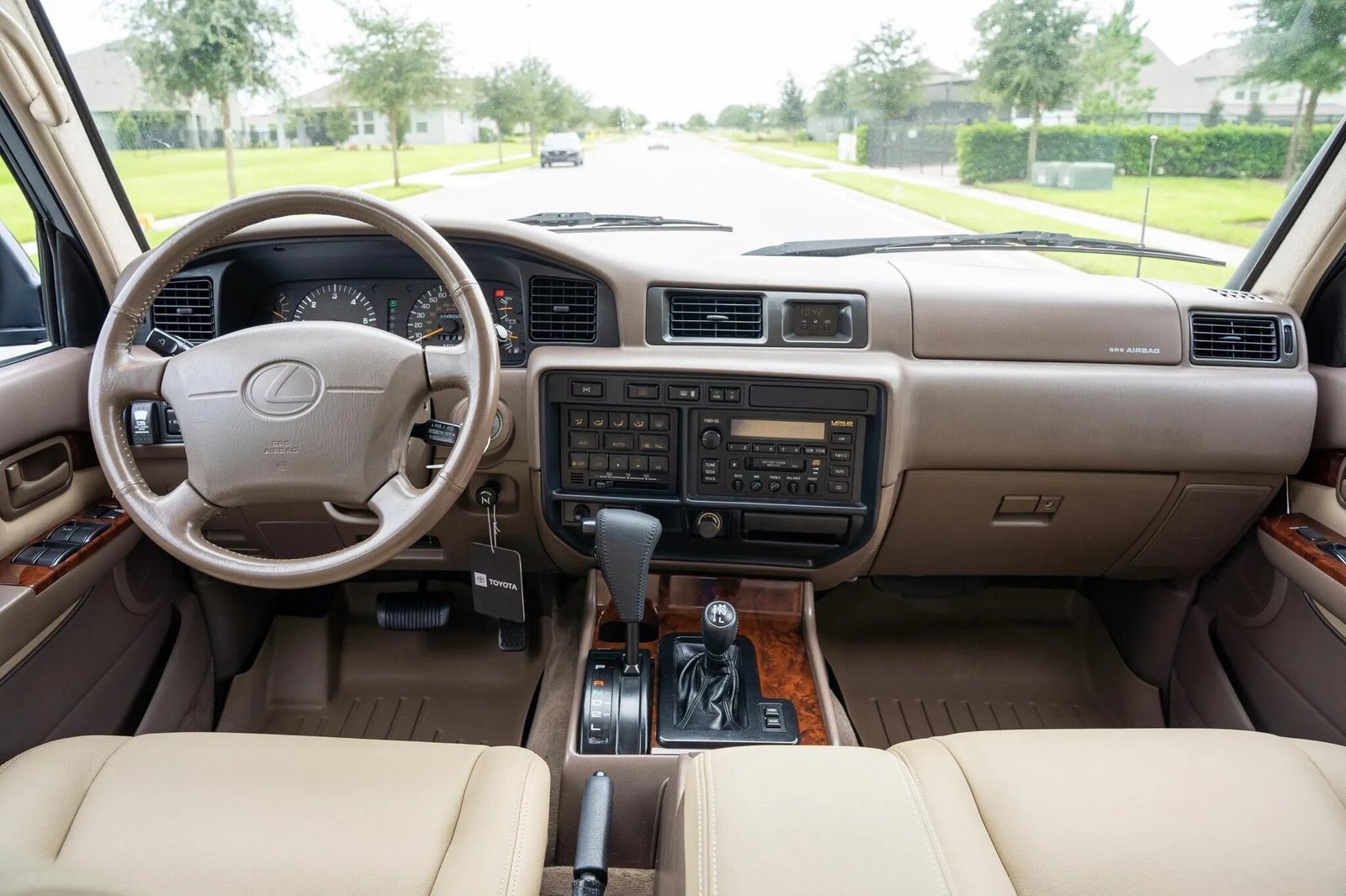 The cabin features seats upholstered in Ivory leather, while wood veneers accent the door panels and center console. Interior amenities include heated power-adjustable front seats, a cassette stereo, a six-disc CD changer, cruise control, and automatic climate control. WeatherTech floor mats protect the carpets.
