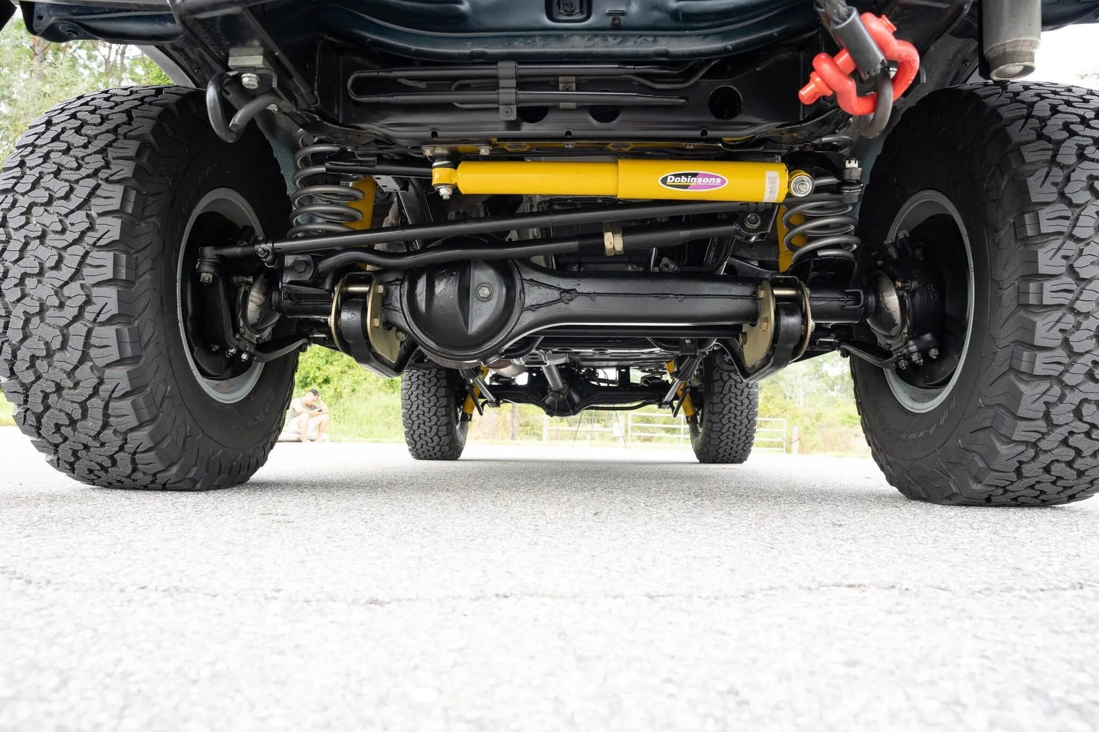 Factory 16″ five-spoke alloy wheels wear 285/75 BFGoodrich All-Terrain T/A K02 all-terrain tires, and a full-size spare is mounted to the swing-out tire carrier. Braking is handled by ventilated discs at each corner, and a Dobinsons suspension suspension lift kit and steering stabilizer are installed.
