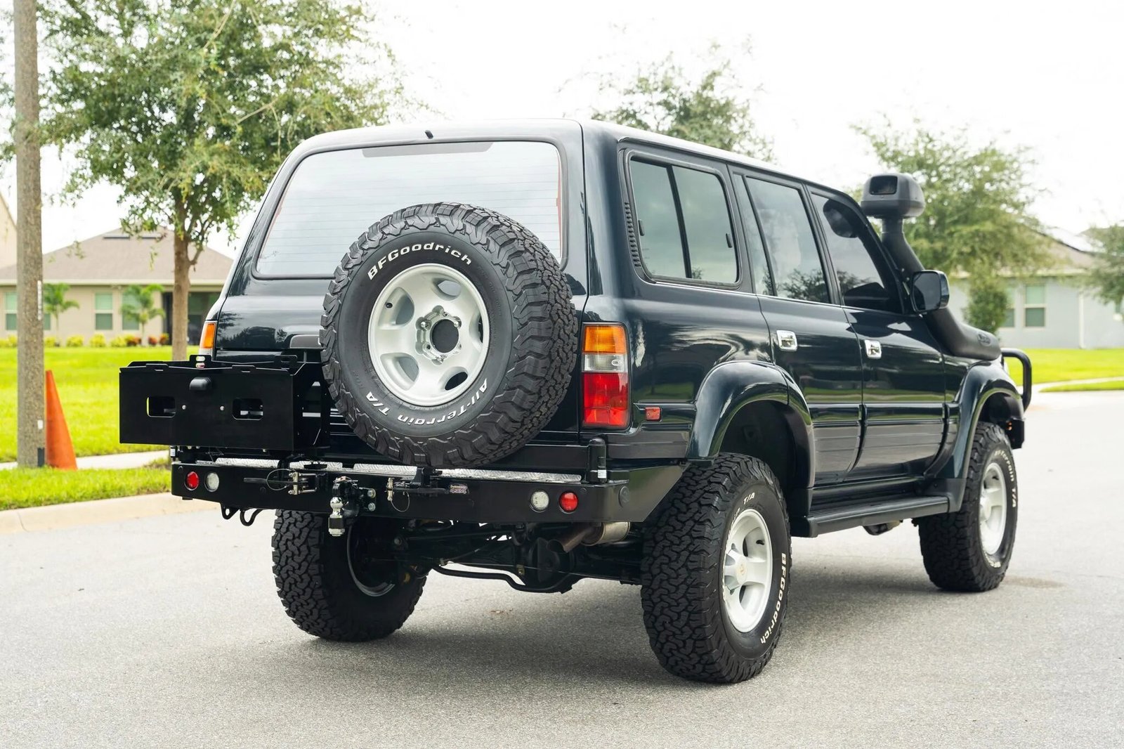 The truck was reportedly refinished in Dark Emerald Pearl (6M1) in 2021, and features a power sunroof, a rear tow ball, a rear window wiper, sliding rear windows, and running boards. Modifications include an ARB front bumper and brush guard, a Smittybilt winch, a Safari snorkel, Baja Designs LED auxiliary lights, and a Dobinsons rear bumper mounted with a swing-away tire carrier and a storage box.