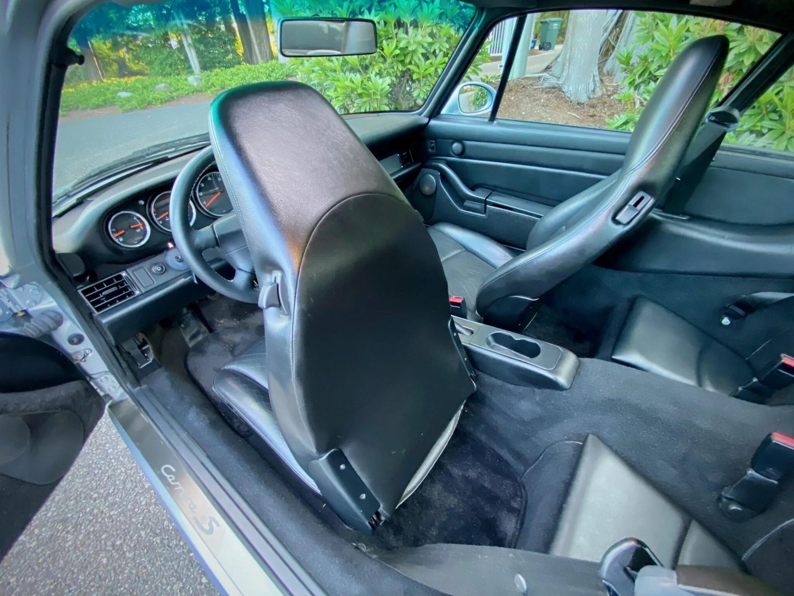 The cabin features power-adjustable seats upholstered in black leather, and Carrera 4S-embroidered mats protect the matching carpets.