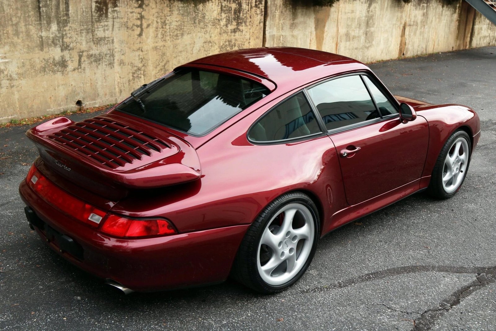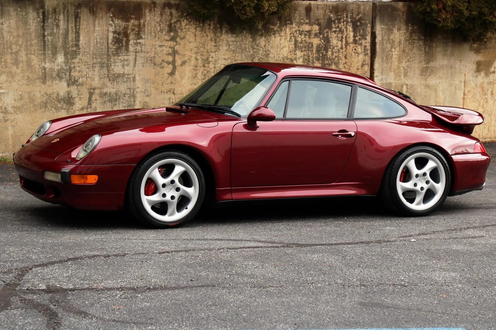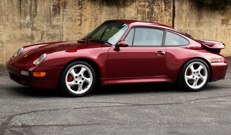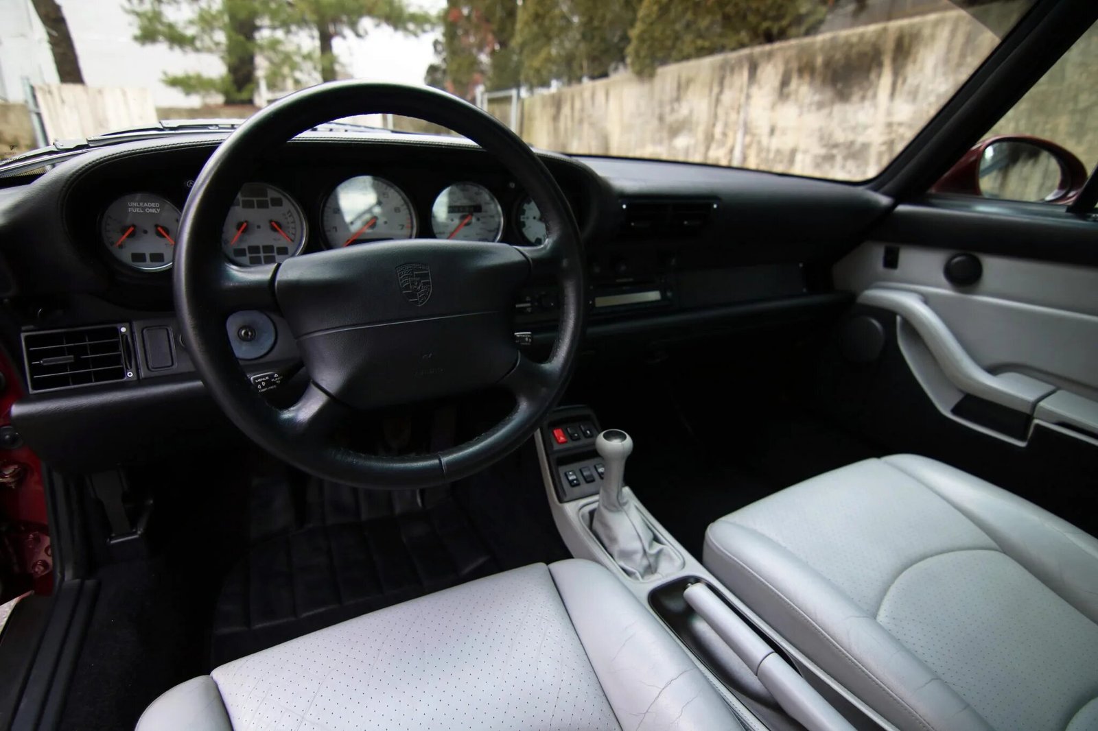 The car is finished in Arena Red over Marble Gray leather and is powered by a twin-turbocharged 3.6L flat-six that drives all four wheels through a six-speed manual transaxle. Equipment includes 18″ wheels, an adjustable Bilstein coilover suspension, a Fabspeed exhaust system, a sunroof, power-adjustable front seats, cruise control, air conditioning, and a Becker stereo. The Turbo differed from the standard 993 Carrera with revised bumper covers, wider rear bodywork, and a fixed rear wing to accommodate top-mount intercoolers.
