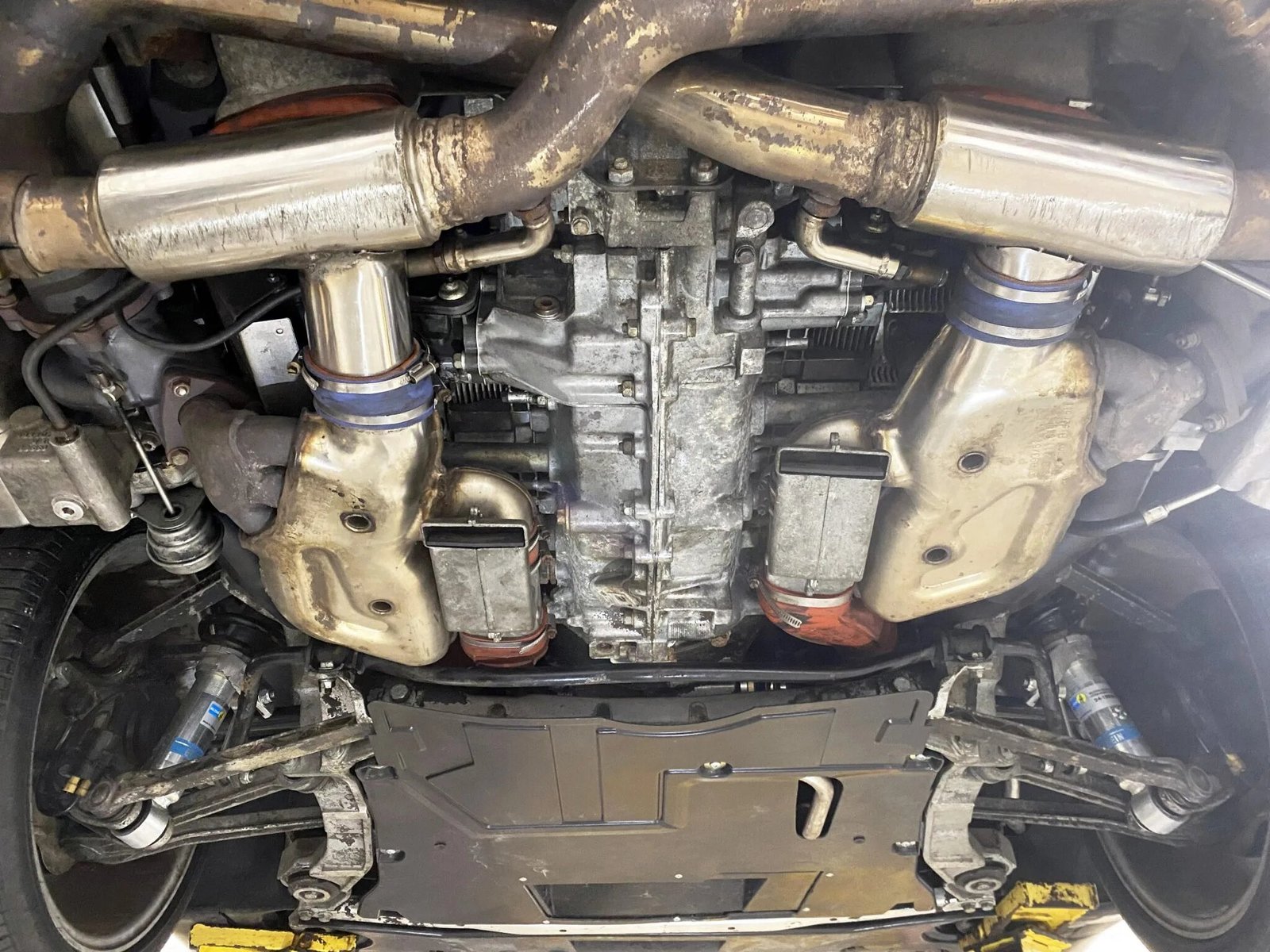 The intercooled and twin-turbocharged 3.6L flat-six is equipped with an aftermarket air intake.