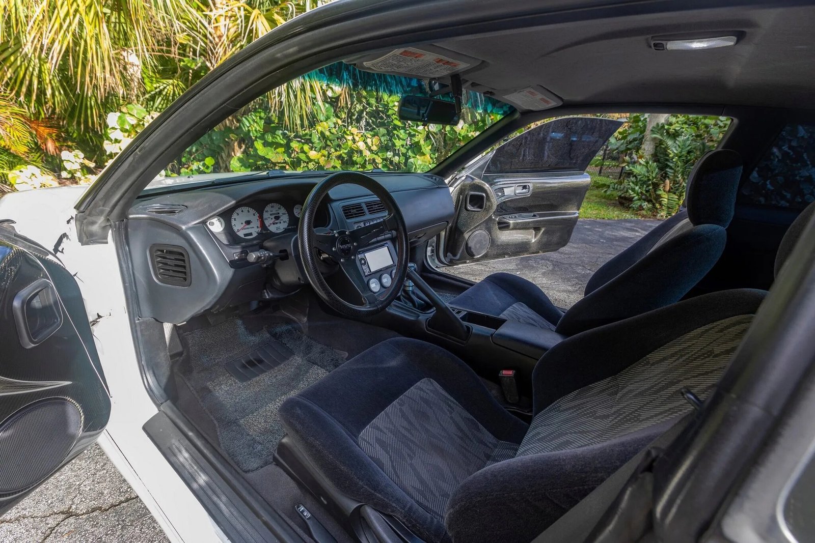 The cabin is upholstered in gray cloth with patterned inserts, and features include air conditioning, a Pioneer touchscreen stereo, carbon-fiber door panels, an S15 shift knob, a Viper alarm system, and Silvia-branded floor mats.