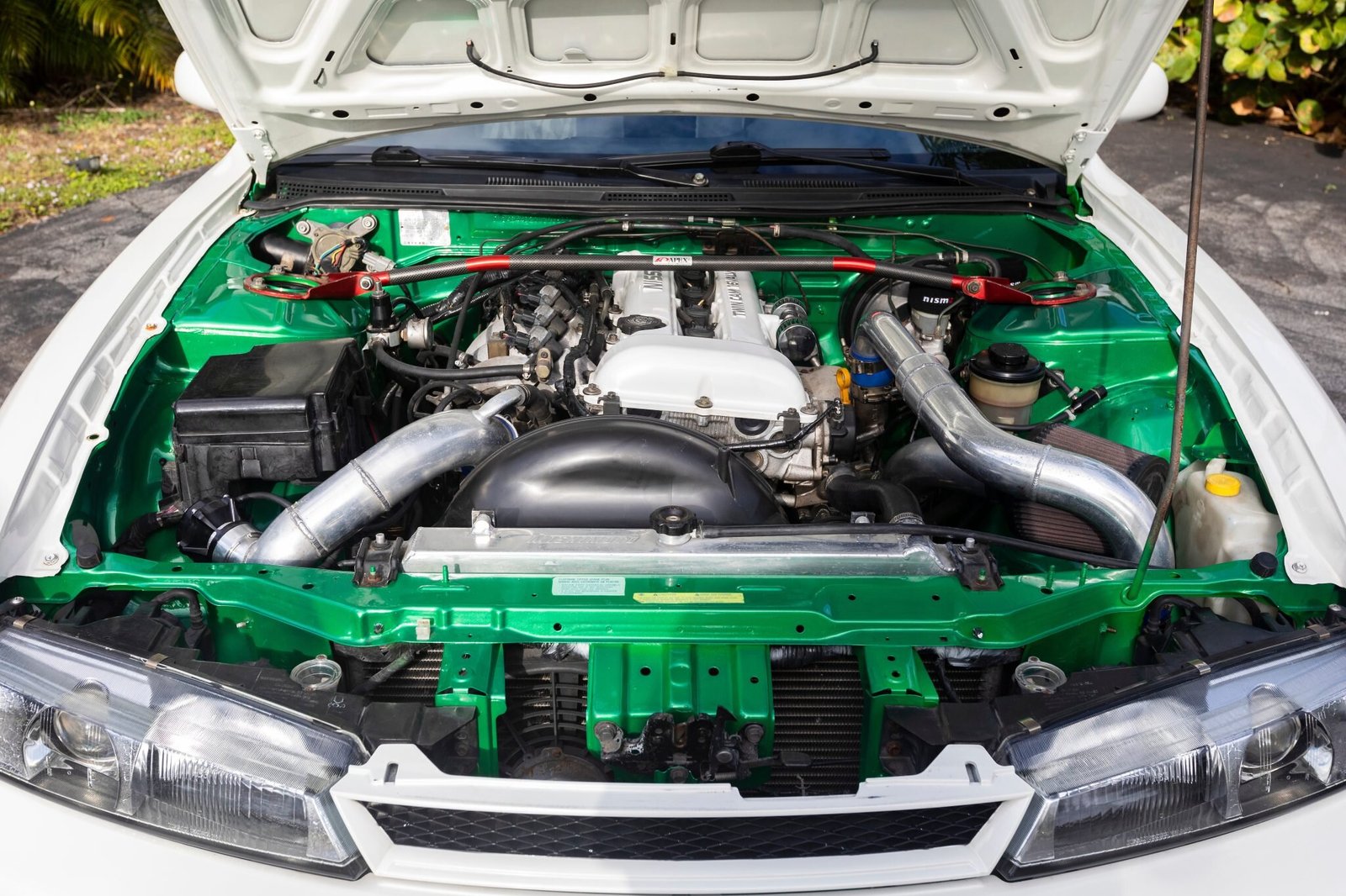 The engine was removed and reinstalled in December 2020 by DNA Performance, and work at that time included repainting the engine bay in Jade Green and fitting the following components: Gasket kit, Water pump, Timing chain kit, timing cover/oil pump, Fan clutch, Upper and lower fan shrouds, NISMO twin-disc clutch, NISMO short shifter, NISMO pivot ball, NISMO slave cylinder, NISMO braided clutch hose, NISMO left and right motor and transmission mounts, NISMO rocker arm stoppers, GKTech solid shifter bushing, Custom air intake with K&N filter.
