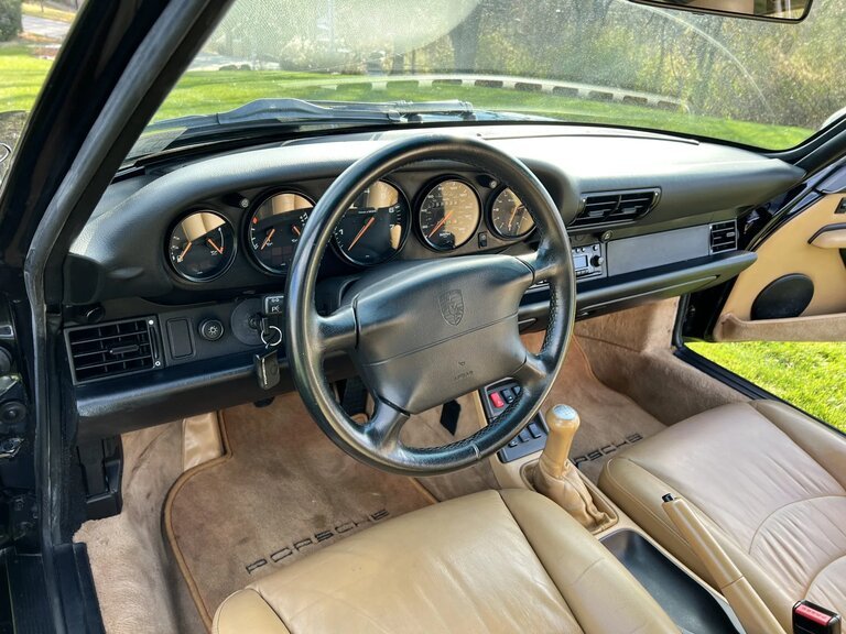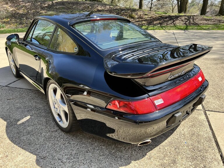 This 1997 Porsche 911 Carrera 4S coupe is finished in black over Cashmere supple leather and is powered by a 3.6-liter flat-six that drives all four wheels through a six-speed manual transaxle with a limited-slip differential. Equipment includes the Motor Sound Package, Aerokit front and rear spoilers, 18″ Turbo Twist wheels, Koni dampers, a power-operated sunroof, cruise control, and air conditioning. The 993 C4S features wider rear bodywork in comparison with the standard Carrera as well as a front air dam derived from the contemporary Turbo.