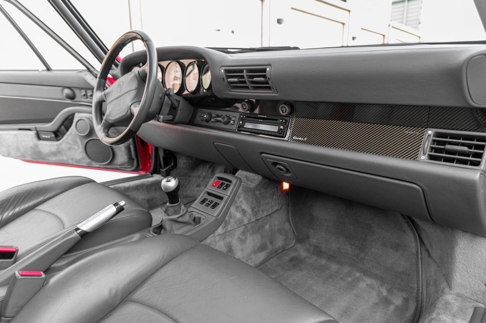 This 1997 Porsche 911 Turbo S is finished in Guards Red over Classic Grey and is one of approximately 180 examples produced for the US market. A twin-turbocharged 3.6L flat-six powers all four wheels through a six-speed manual transaxle. The Turbo S model received larger turbochargers from the factory, as well as an extra oil cooler, integrated rear fender scoops, unique exterior aerodynamics, larger brakes with yellow calipers, a full-leather interior with carbon fiber trim, and a quad-outlet exhaust.