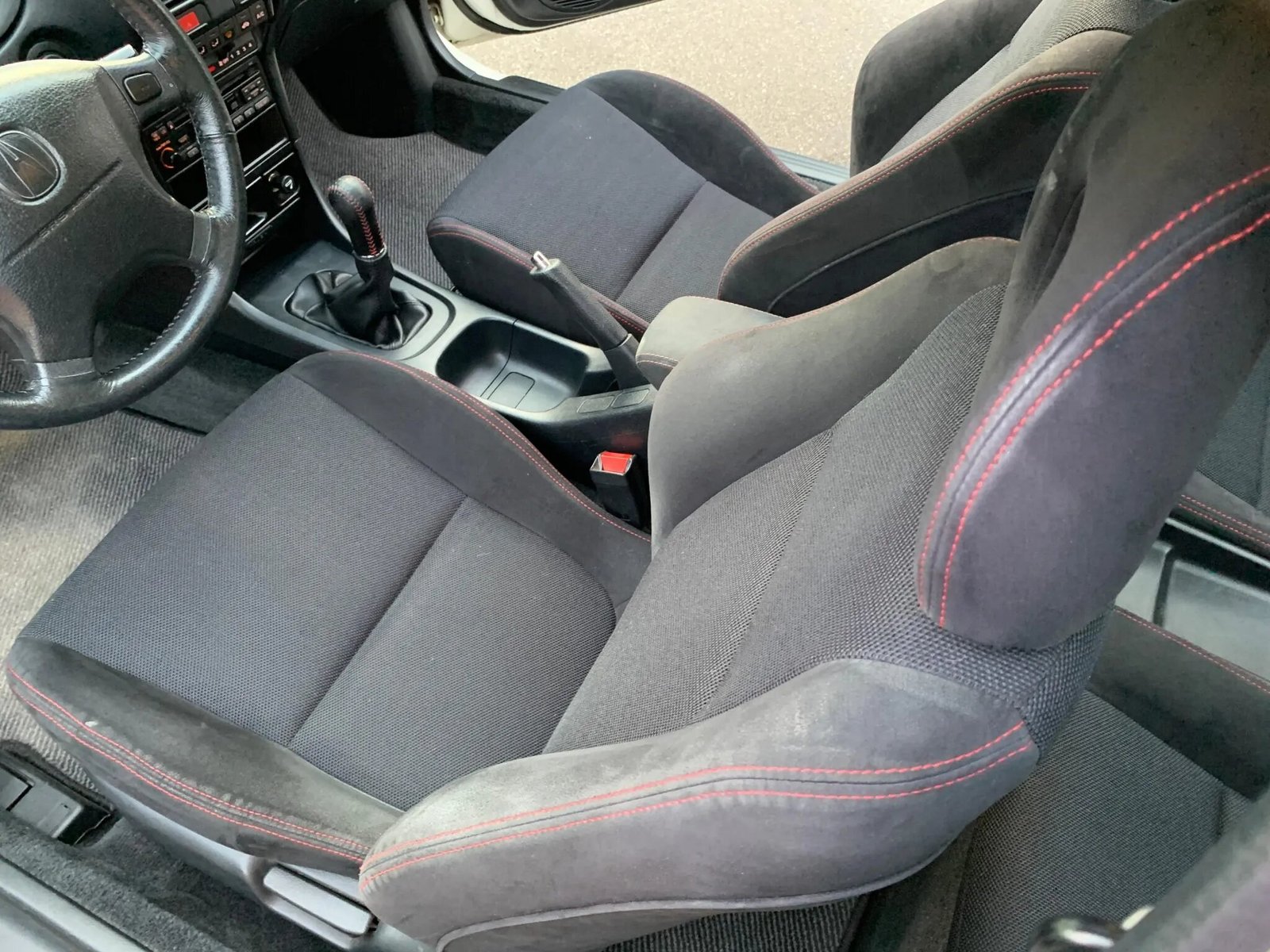 The cabin features seating surfaces upholstered in black microsuede and cloth with red accent stitching. Amenities include air conditioning, Acura-branded floor mats, a digital clock, power windows and locks, and a CD stereo.