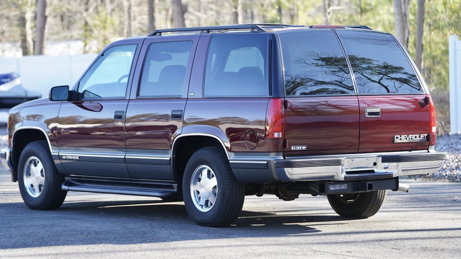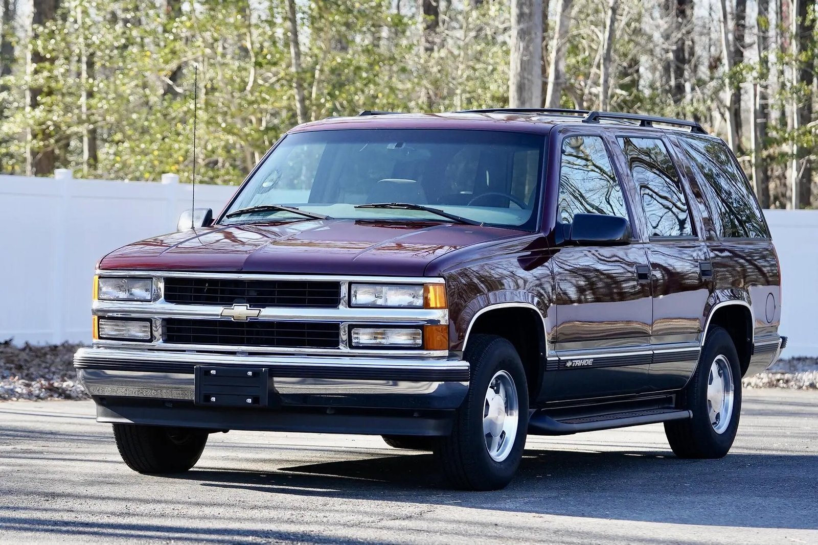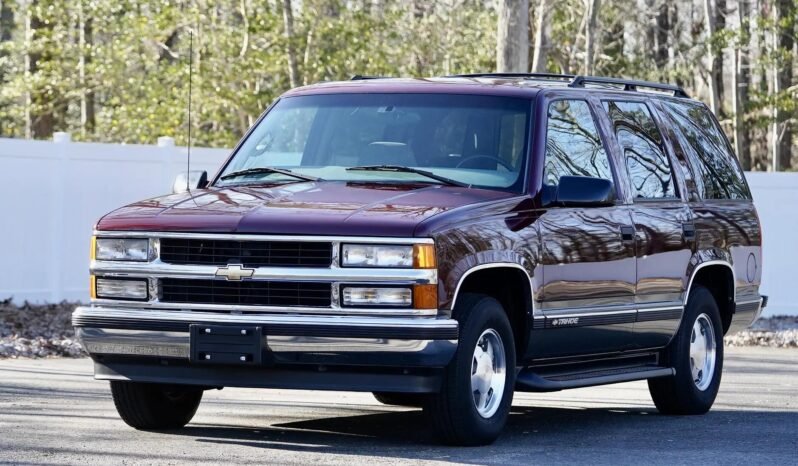 This 1999 Chevrolet Tahoe LS four-door example is powered by a 5.7-liter V8 mated to a four-speed automatic transmission and is finished in maroon with gray lower cladding over gray cloth upholstery. Equipment includes 15″ wheels, running boards, a rear step bumper, ambulance-style cargo doors, and a receiver hitch as well as cruise control, front and rear air conditioning controls, power-adjustable front seats, an overhead console, and a Delco cassette stereo with a CD player.