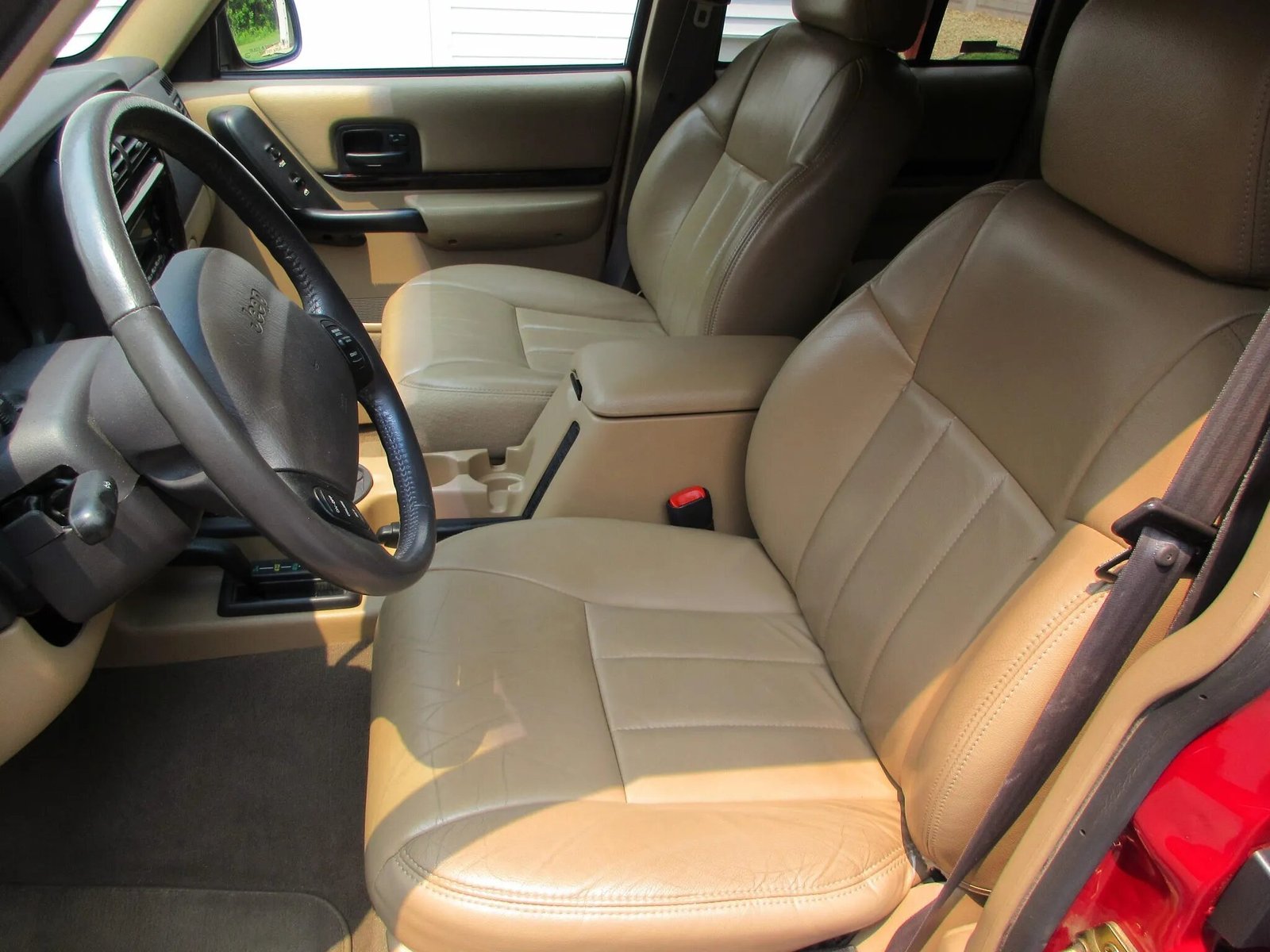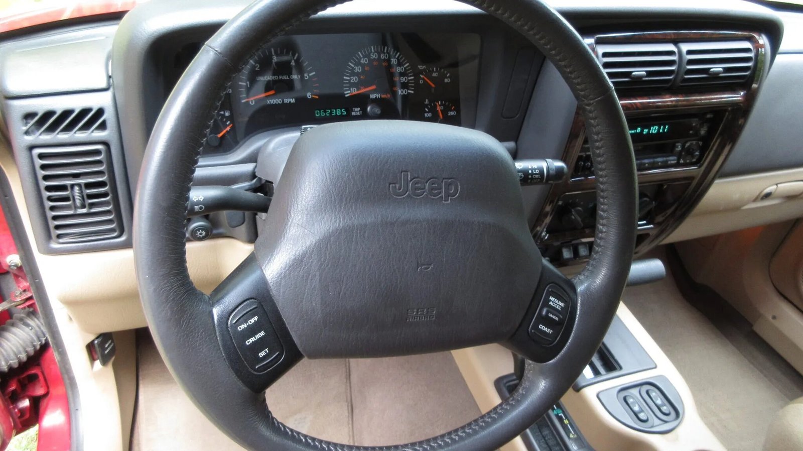 This 1999 Jeep Cherokee Limited 4×4 it is finished in Chili Pepper Red Pearl Coat over Camel leather upholstery and powered by a 4.0-liter inline-six paired with a four-speed automatic transmission and a dual-range transfer case. Additional equipment includes 15″ aluminum wheels, roof rails with crossbars, fog lights, heated and power-folding side mirrors, cruise control, air conditioning, power-adjustable front seats, and a factory CD/cassette stereo.