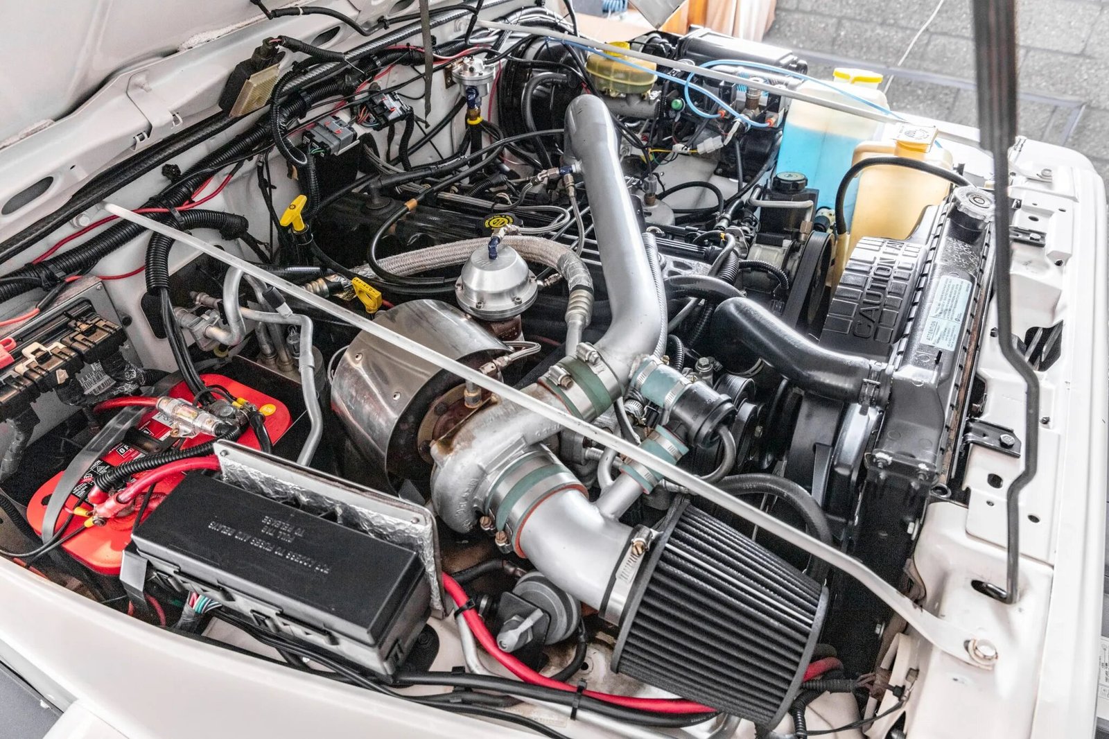 The 4.0-liter inline-six was fitted with an aftermarket turbocharger, The engine bay houses an onboard air compressor and a battery cut-off switch.