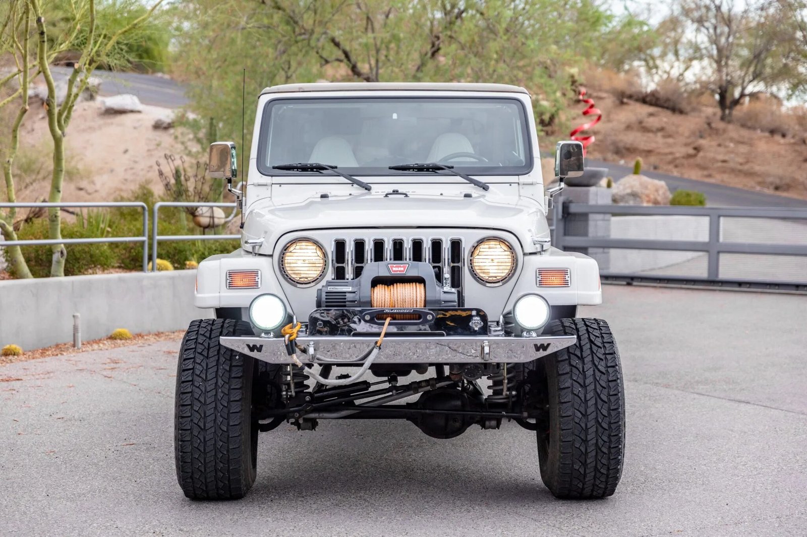 The truck is finished in white with a removable tan hardtop over white leather upholstery, and additional modifications include a lifted suspension, front and rear air lockers, an onboard air compressor, custom bumpers, 15″ chrome-finished Center Line wheels, a Warn winch, Rock Slide Engineering step sliders, and an Alpine head unit.