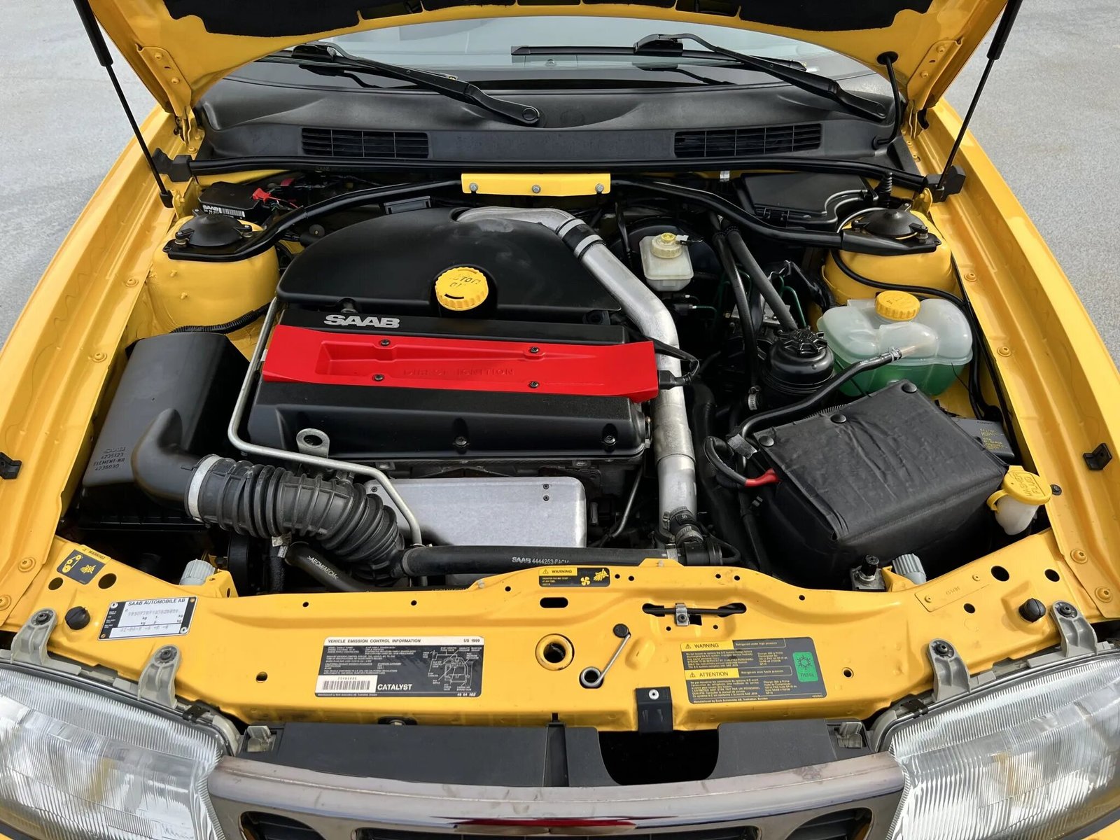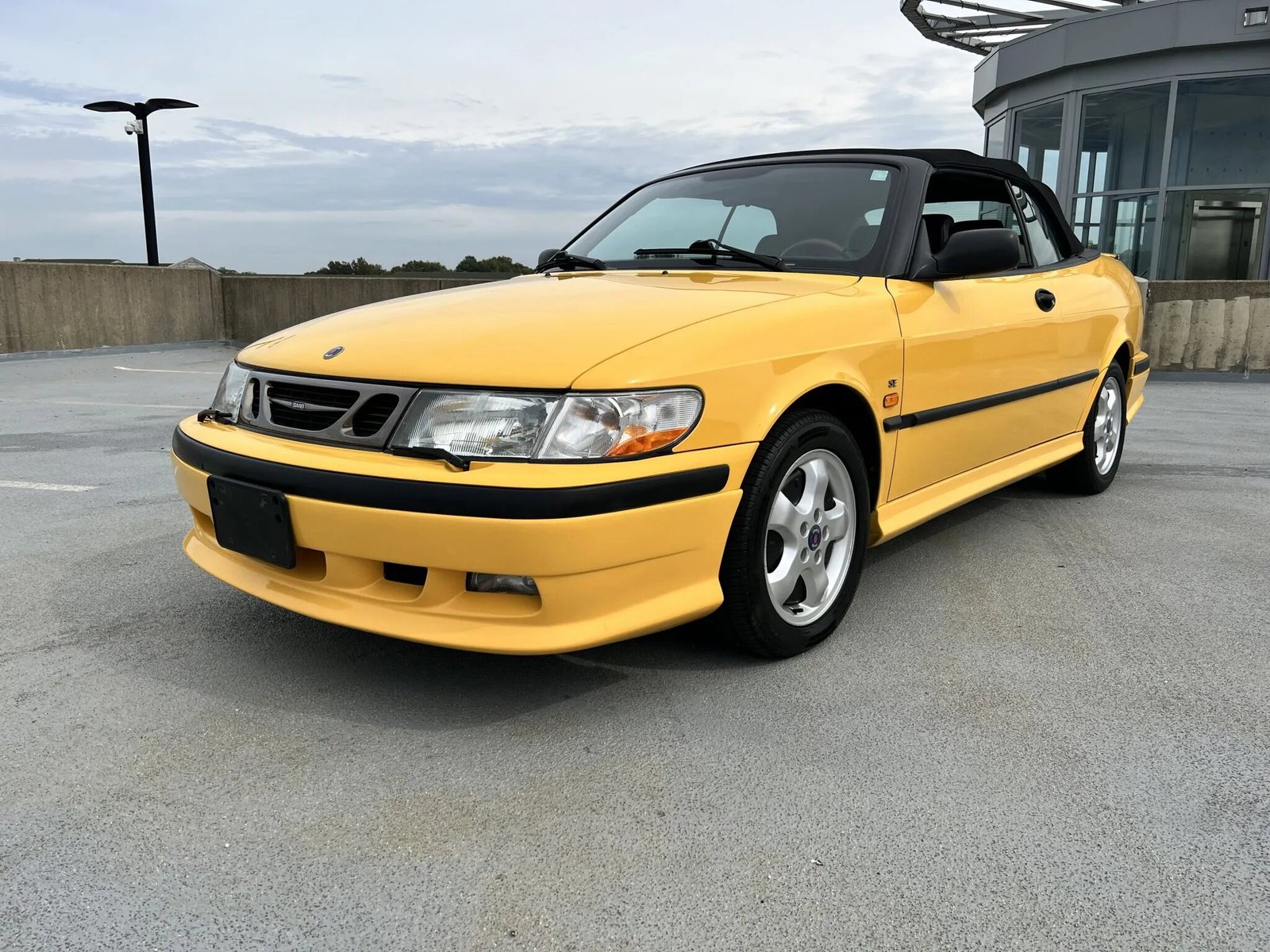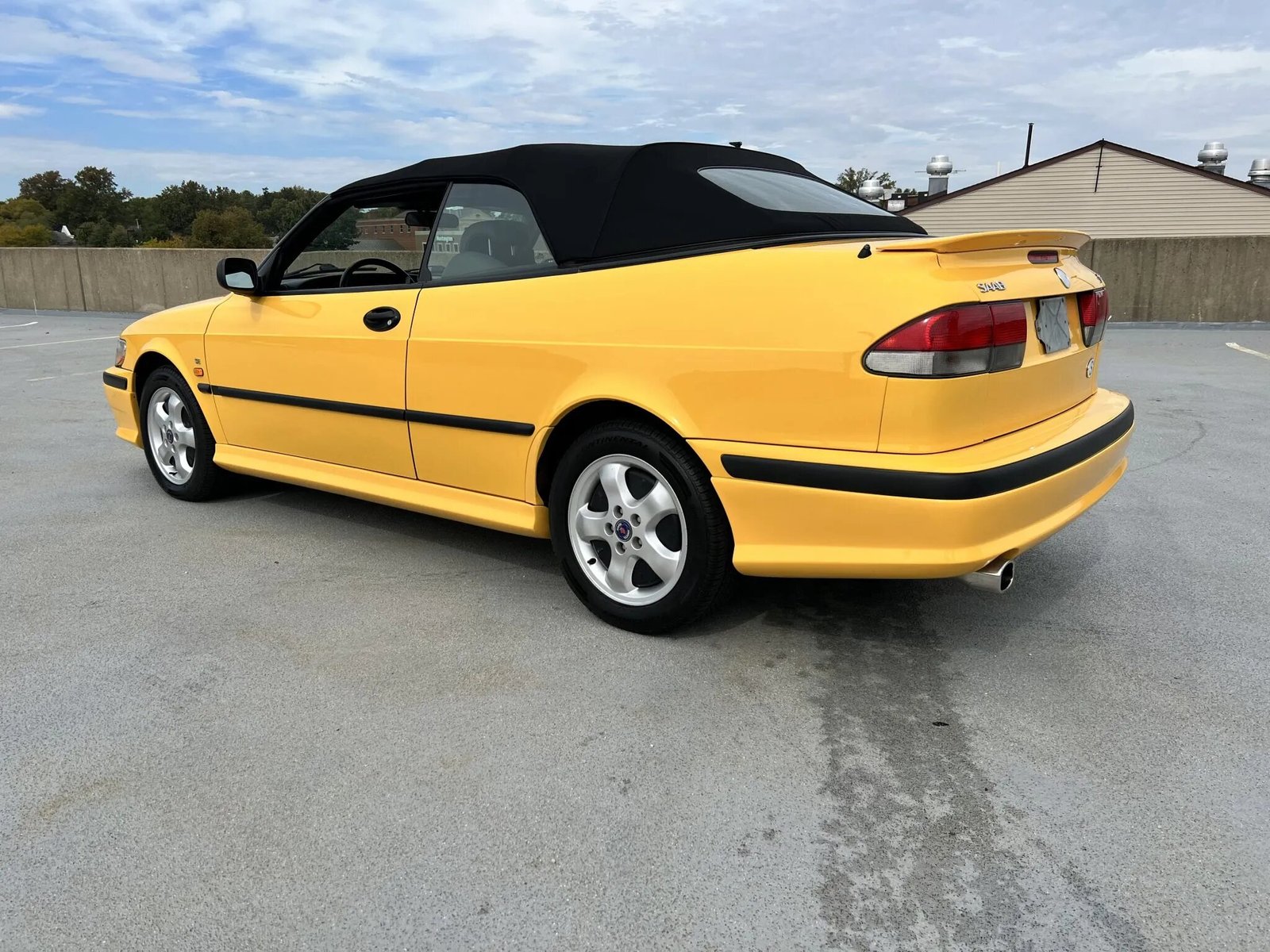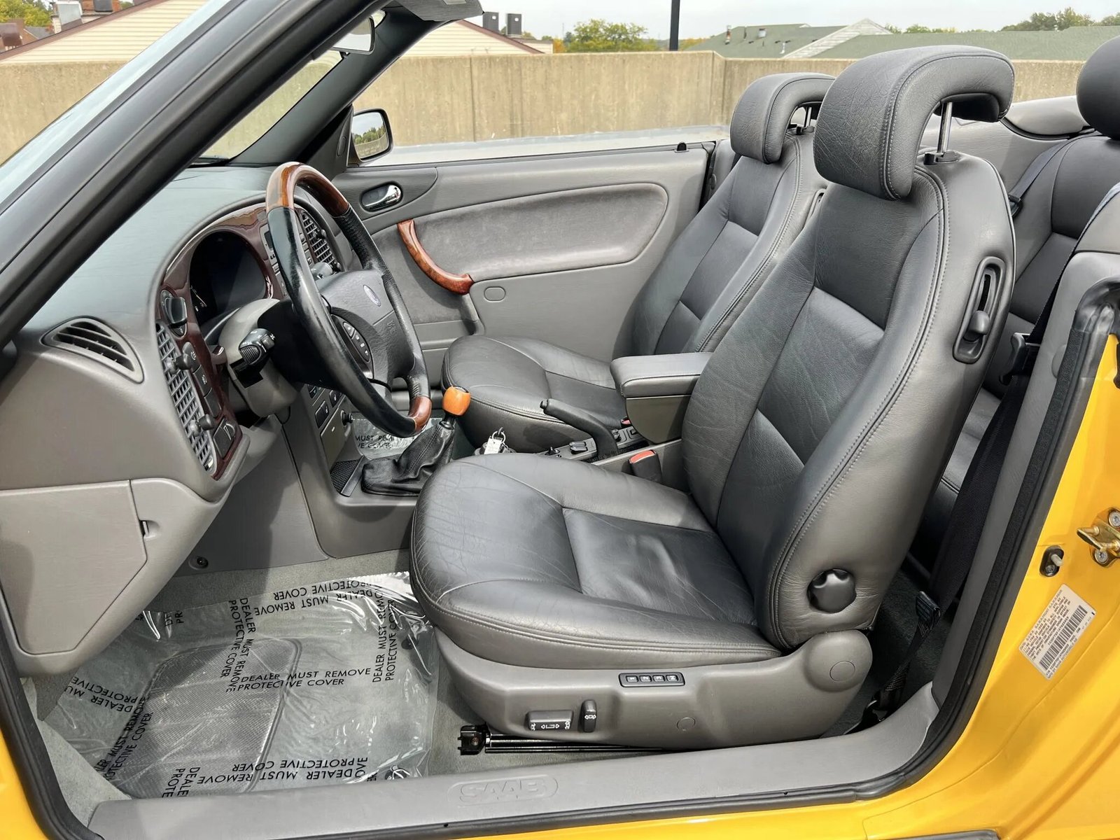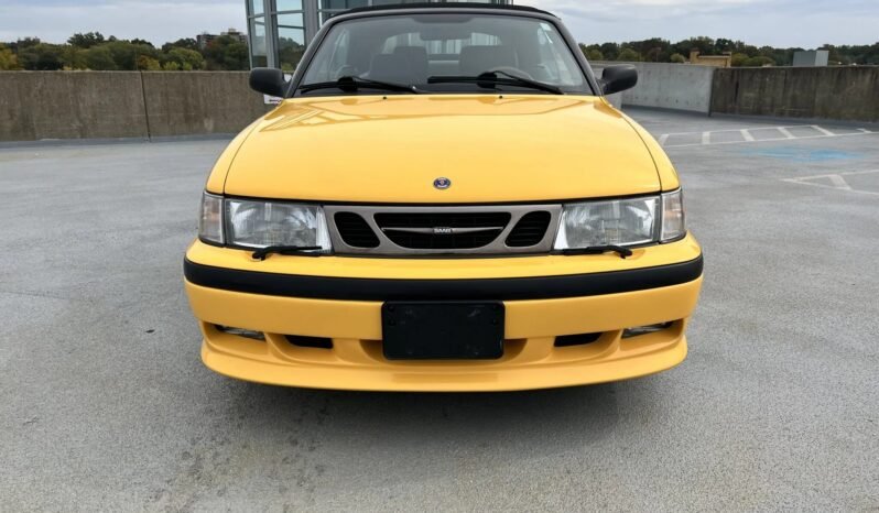 This 1999 Saab 9-3 SE convertible is finished in Monte Carlo Yellow over gray leather upholstery and is powered by a turbocharged 2.0-liter inline-four mated to a five-speed manual transaxle. Equipment includes a power-operated black soft top, 16″ alloy wheels, headlight wipers, a rear spoiler, heated and power-adjustable front seats, automatic climate control, and a CD stereo.