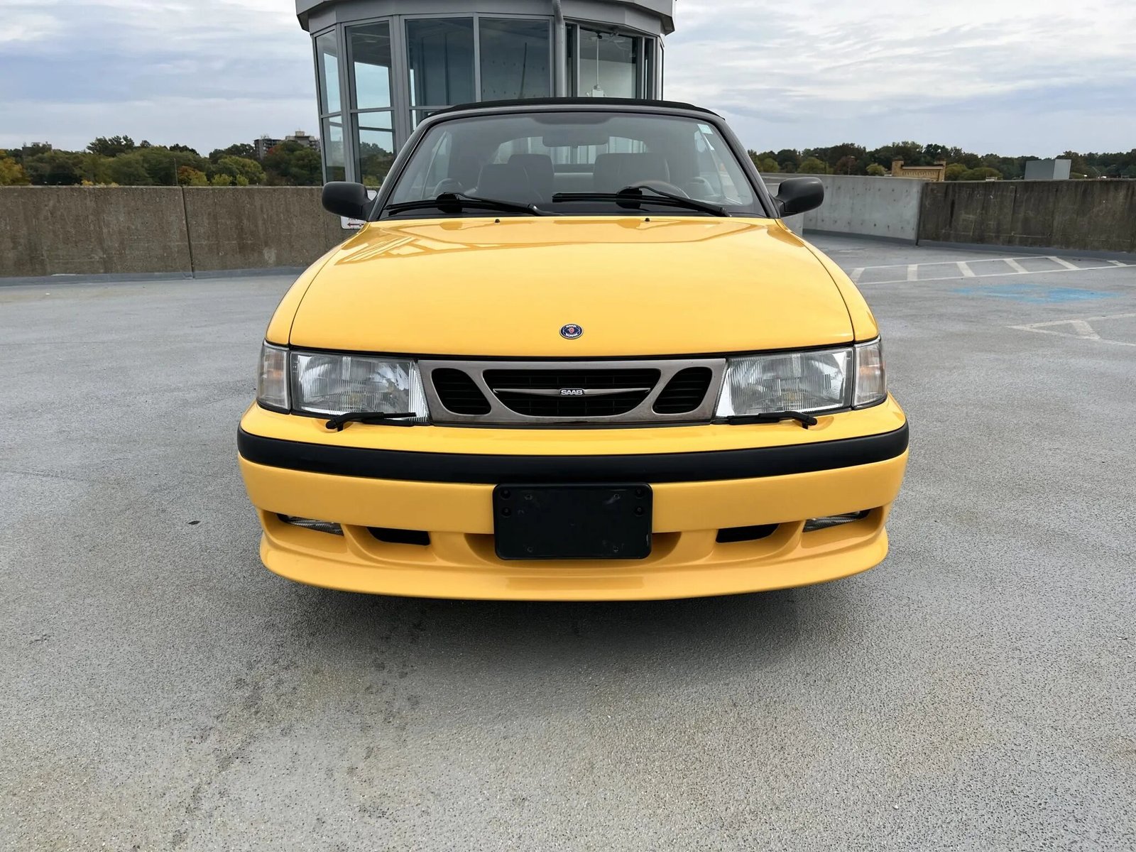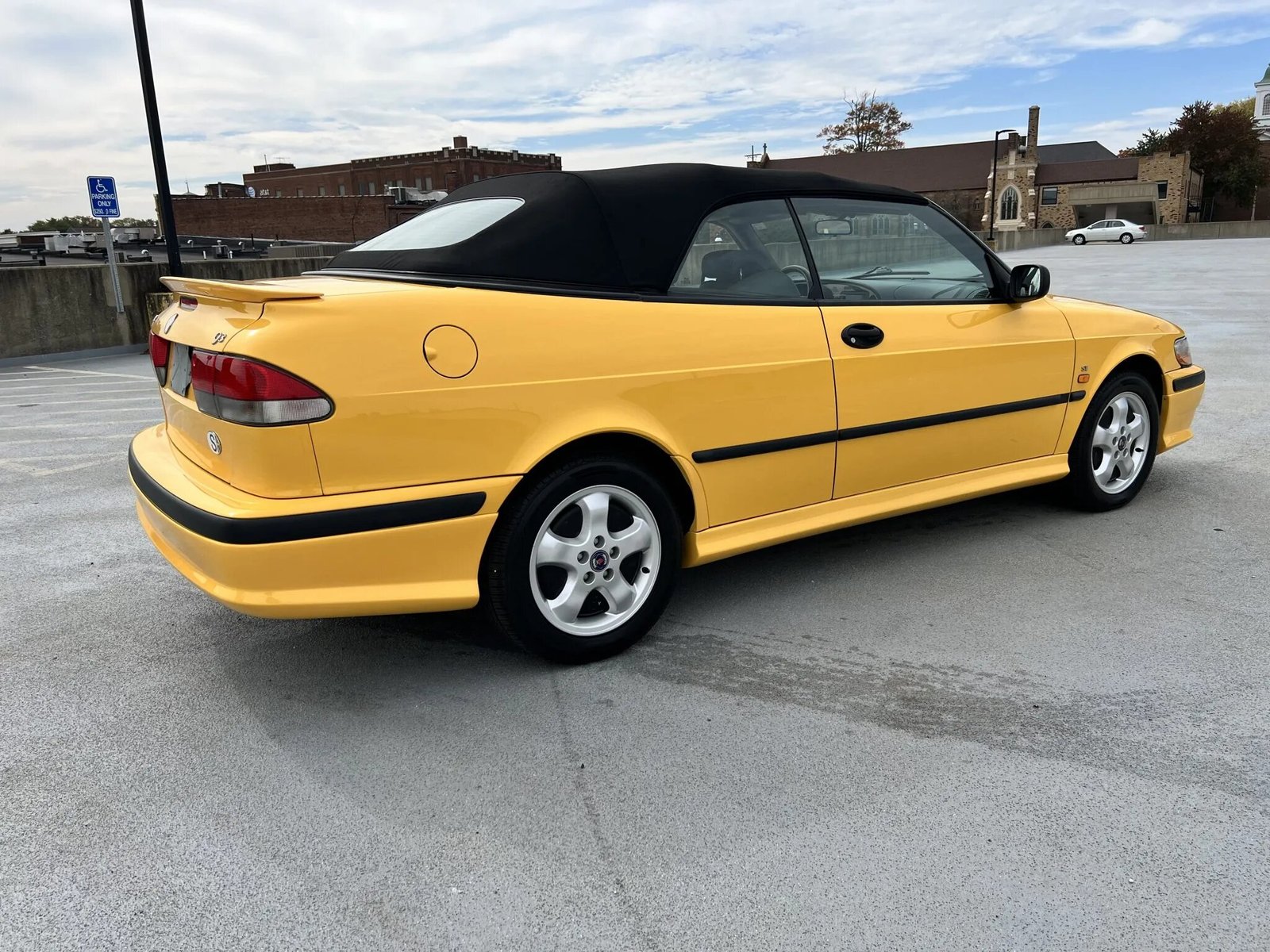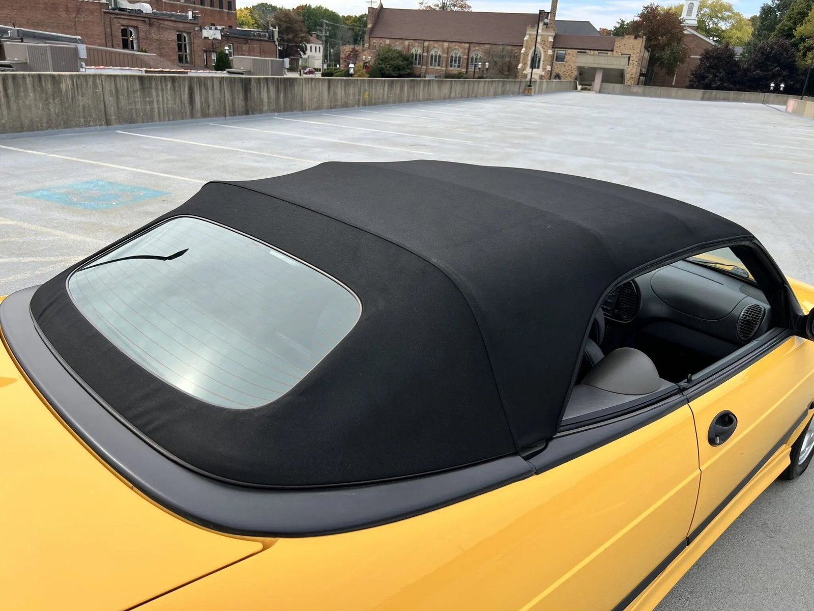The car is one of 68 US-market examples finished in Monte Carlo Yellow for the model year and features a power-operated black soft top and a rear spoiler. Additional exterior details include fog lights, headlight wipers, and black side moldings.