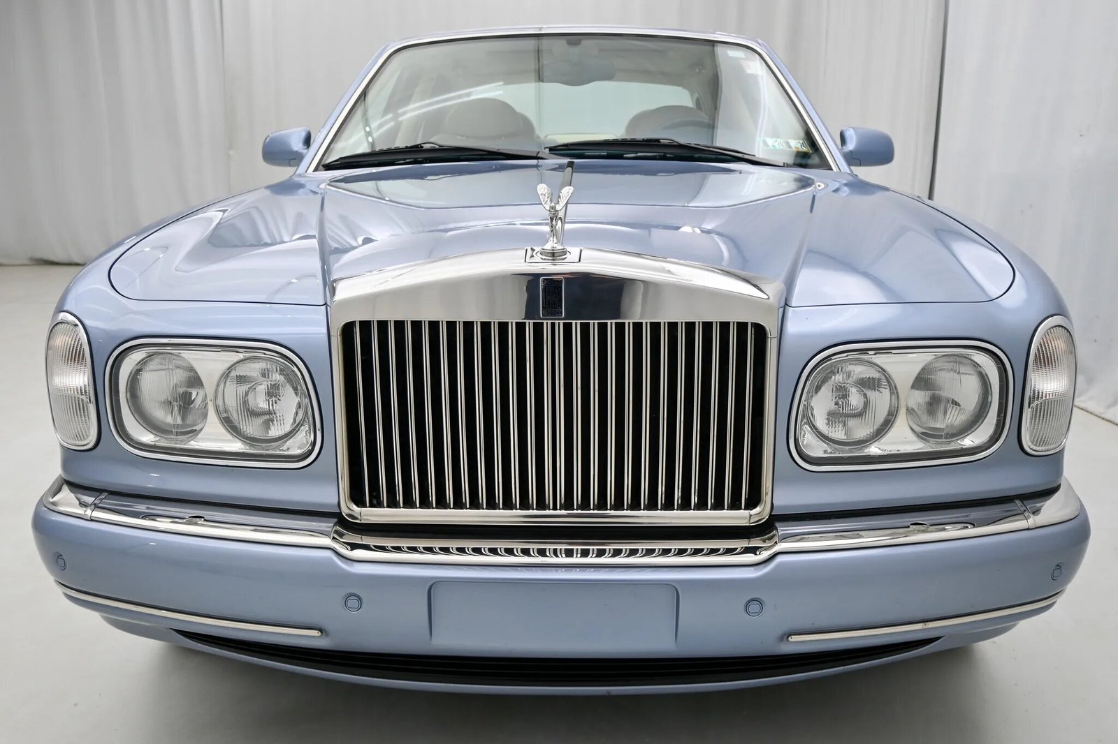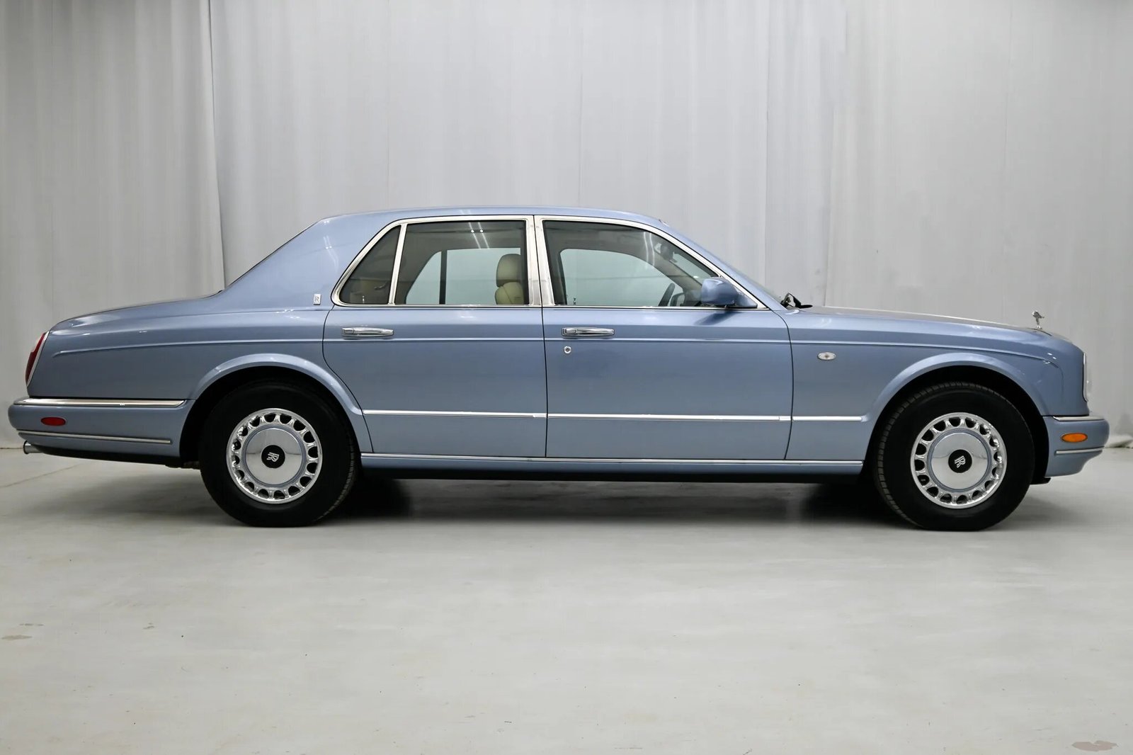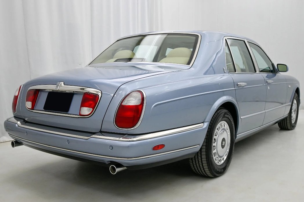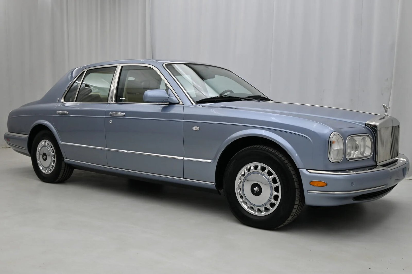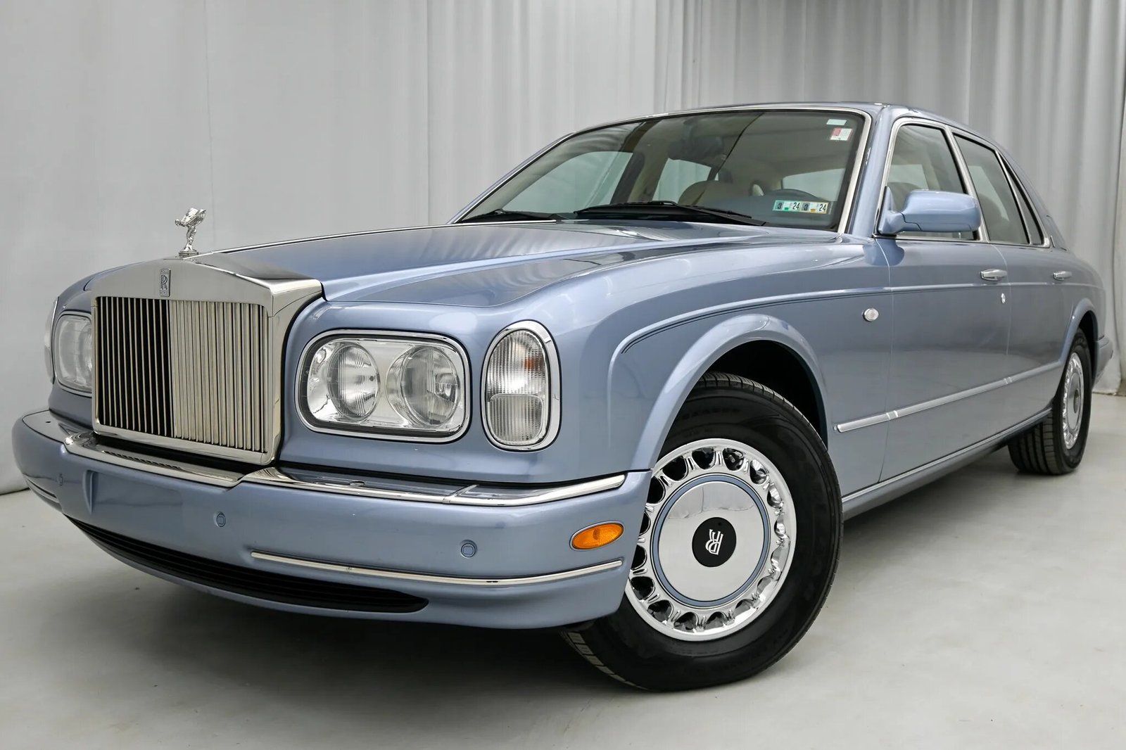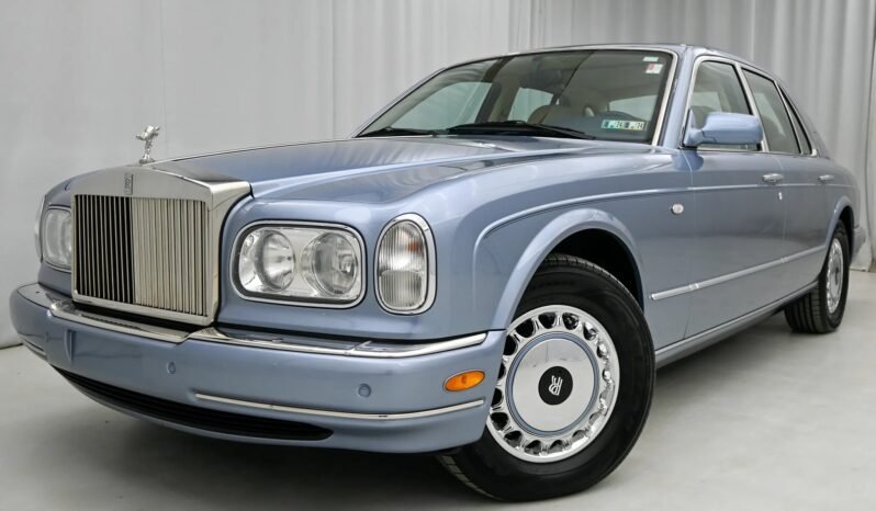 This 2000 Rolls-Royce Silver Seraph is powered by a 5.4-liter V12 paired with a five-speed automatic transmission and is finished in Grigio Silverstone Metallic over beige leather. Additional equipment includes 16″ wheels, a sunroof, parking sensors, dual-zone automatic climate control, heated seats, rear tray tables, navigation, and an Alpine cassette stereo linked to a CD changer mounted in the center console.