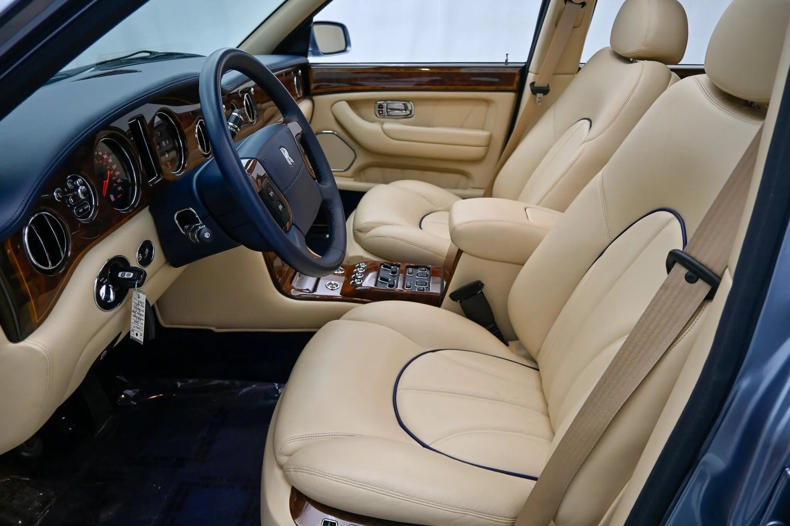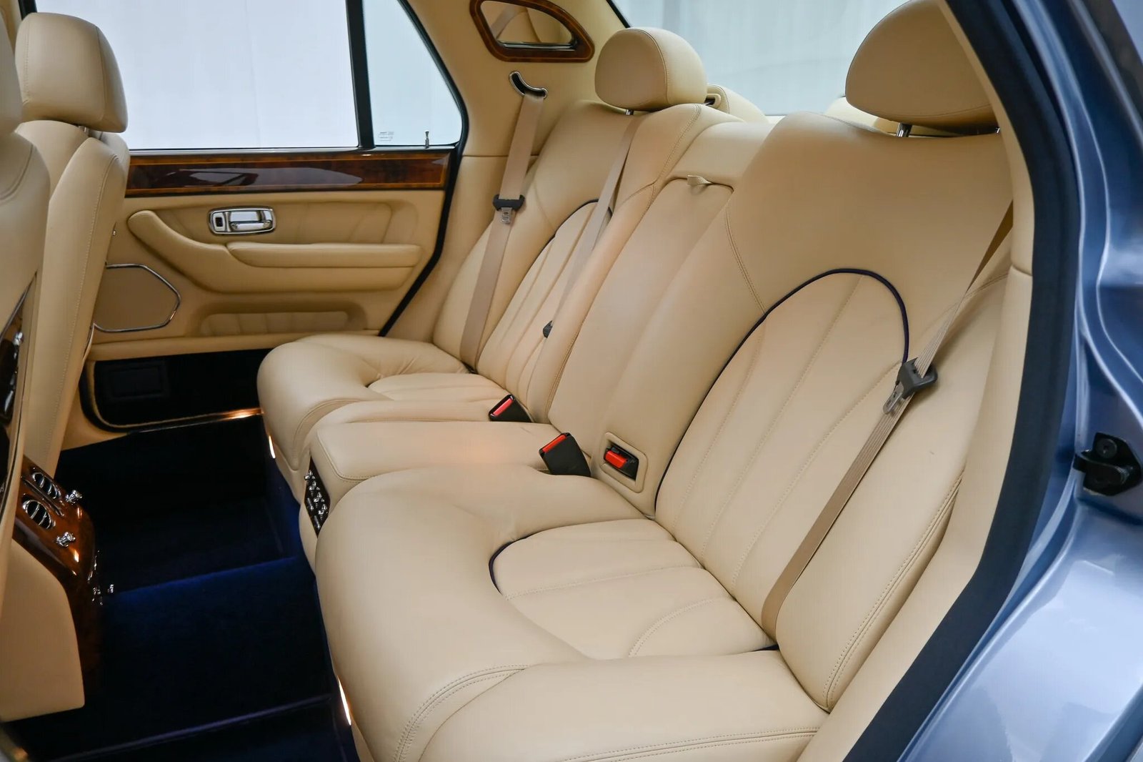 The seating surfaces are trimmed in beige leather upholstery with blue piping and are joined by wood veneer that accents the dashboard, center console, front seat adjustment switches, rear tray tables, and door inserts.