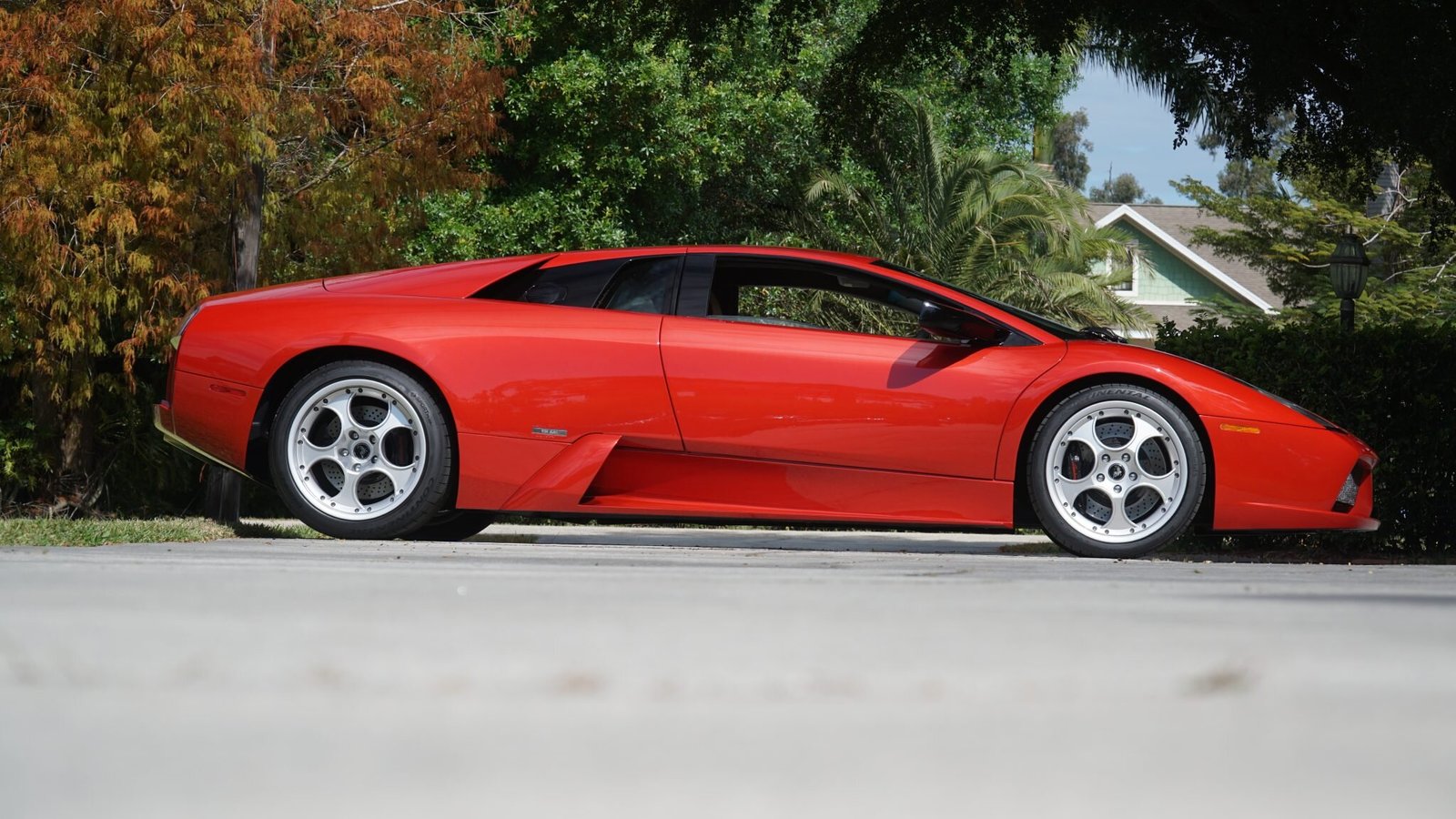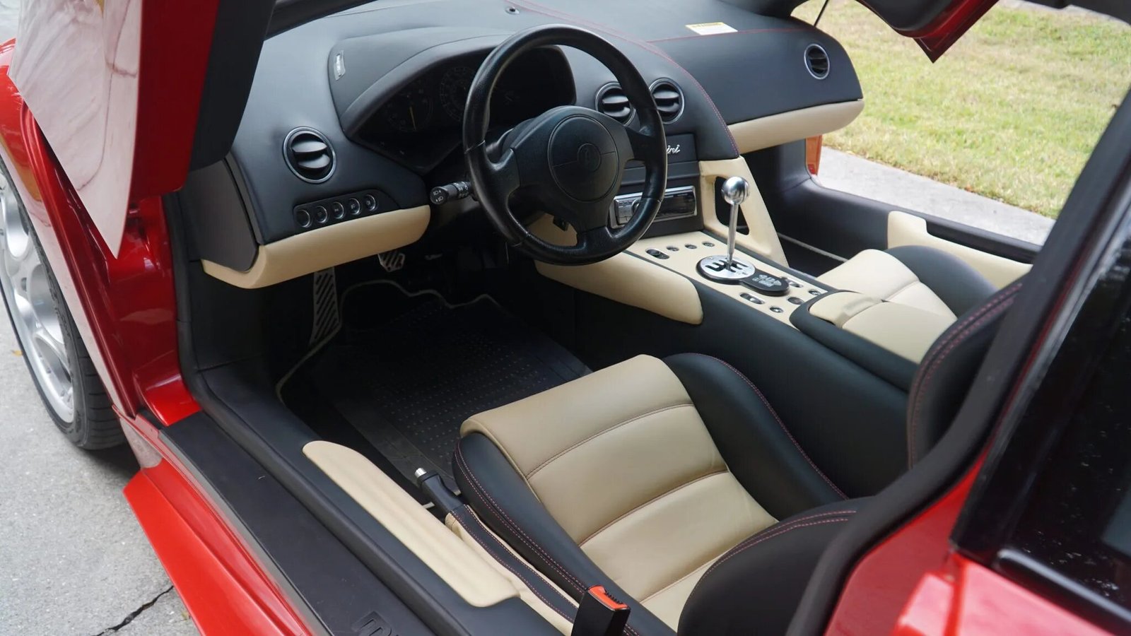 This 2002 Lamborghini Murciélago is finished in red over black and tan leather upholstery, and the 6.2-liter V12 sends power to all four wheels via a gated six-speed manual transmission. Features include a front axle lift system, automatic climate control, and a Pioneer stereo. Service performed in preparation for the sale included the installation of a replacement front axle lift hydraulic valve block and sensors, new tires, a refinishing of the wheels, an oil change, and a brake fluid flush.