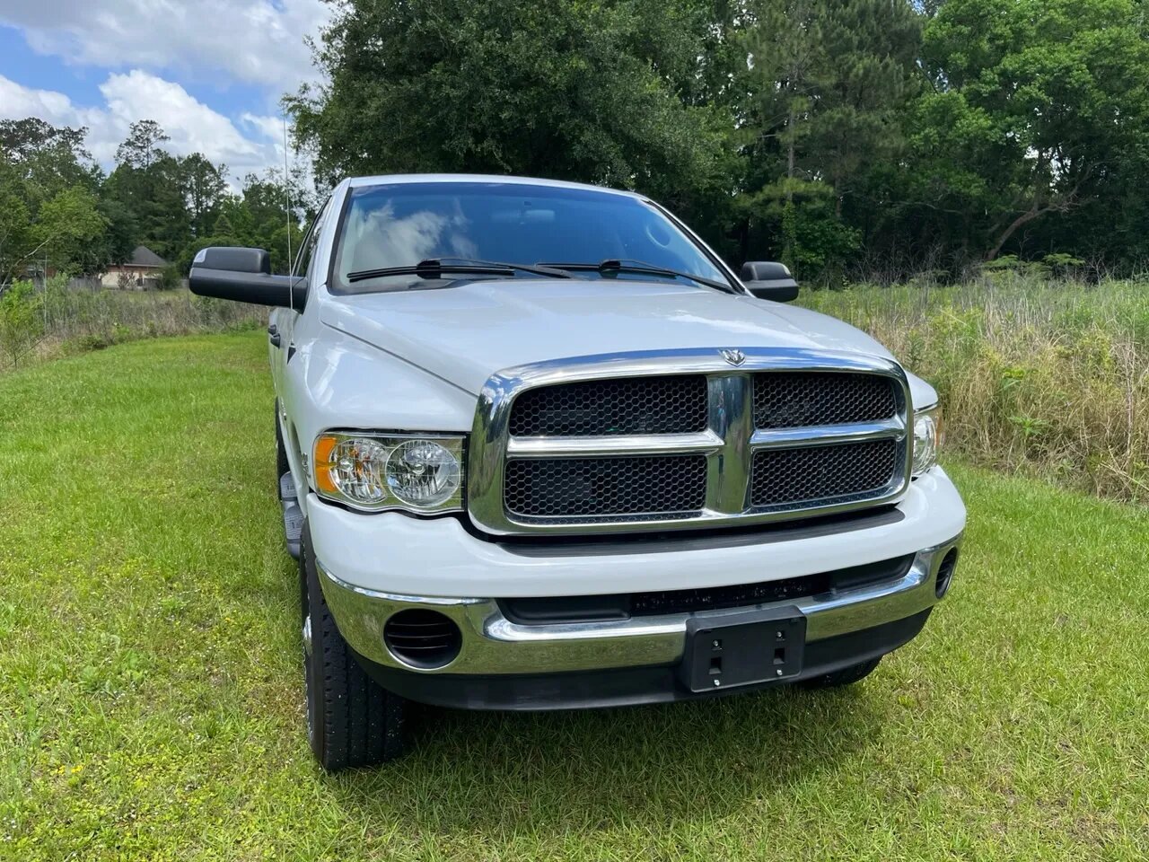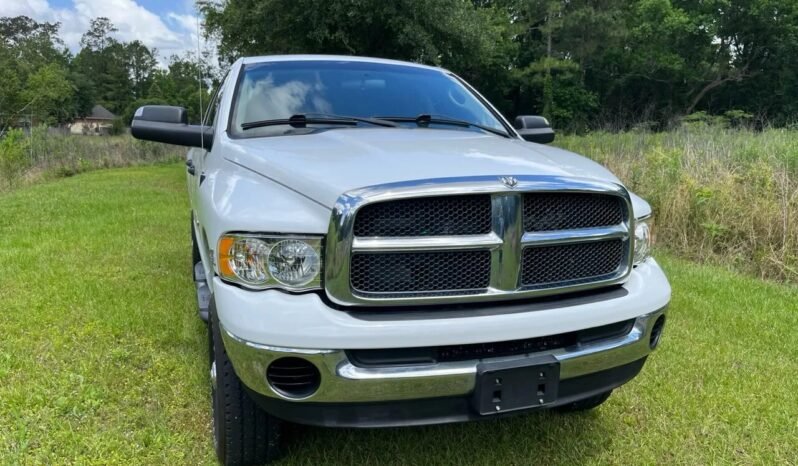This 2004 Dodge Ram 2500 SLT is a Quad Cab example powered by a 5.9-liter Cummins turbodiesel inline-six linked to a four-speed automatic transmission and a dual-range transfer case, and it is finished in Bright White over Dark Slate Gray cloth upholstery. Equipment includes 18″ wheels, an MBRP exhaust, tinted windows, tubular side steps, a DuraLiner bed liner, Bushwacker bed rail caps, LED backup lights, a receiver hitch, an aftermarket Pioneer head unit, air conditioning, and cruise control.