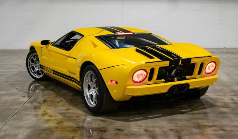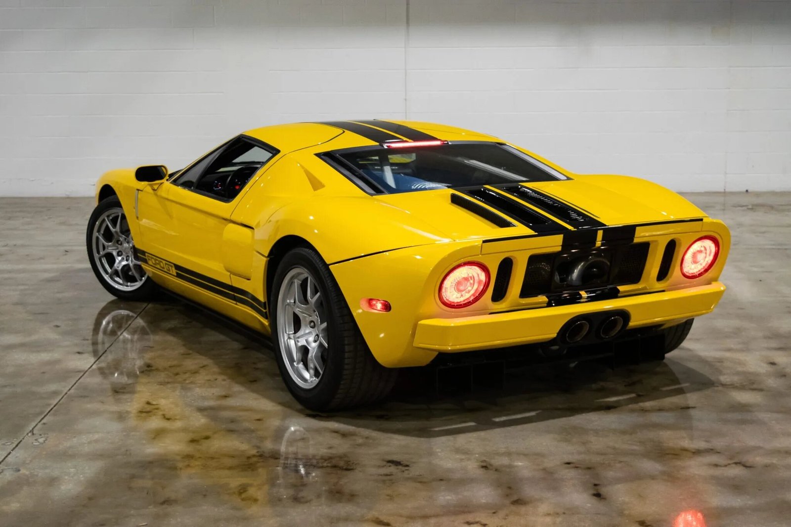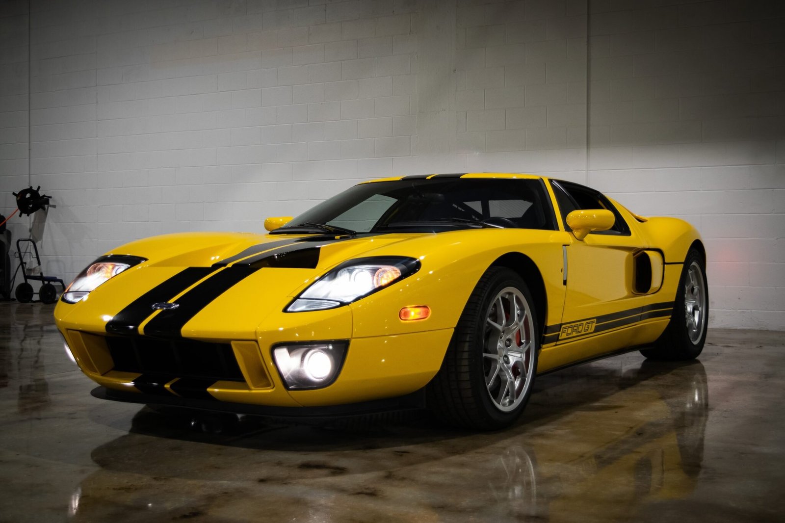 This 2006 Ford GT is one of 2,011 examples built for the model year, and it is powered by a supercharged 5.4-liter V8 linked with a six-speed manual gearbox and a helical limited-slip differential. The car is finished in Speed Yellow over Ebony leather and is equipped with all four factory options, which consist of forged aluminum BBS wheels, red-finished brake calipers, painted black racing stripes, and a McIntosh stereo system. Additional equipment includes a Heffner Performance exhaust system, Brembo brakes, HID headlights, a front splitter, a rear diffuser, and air conditioning.