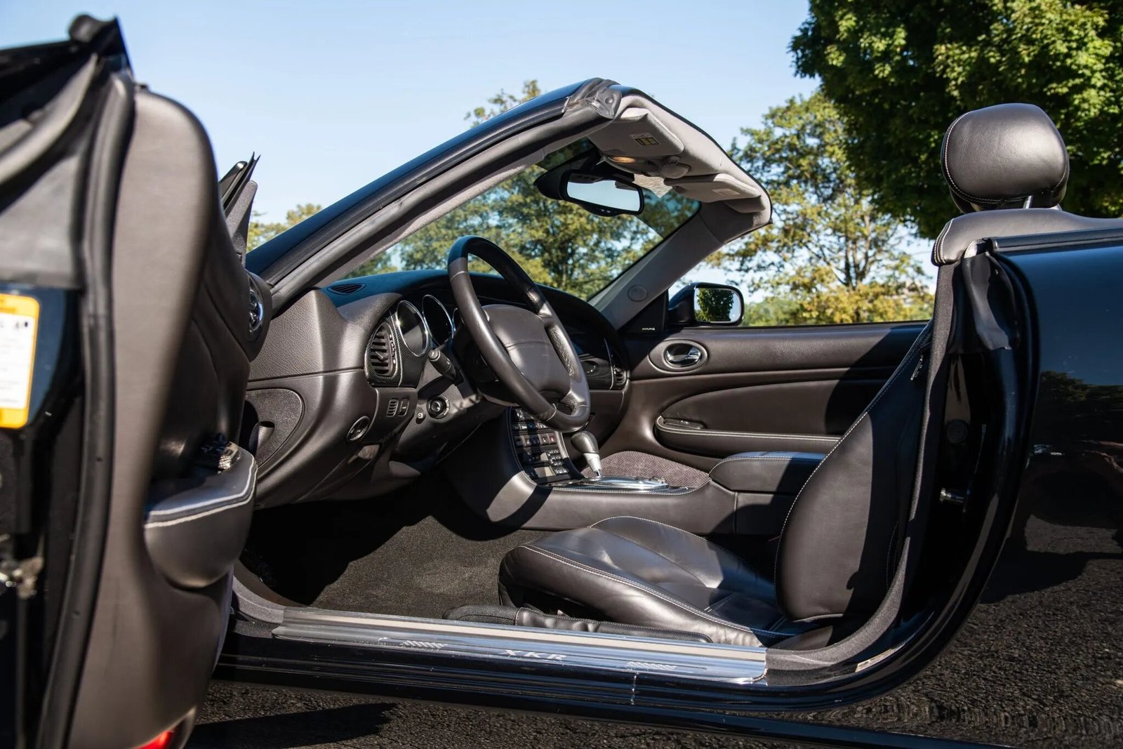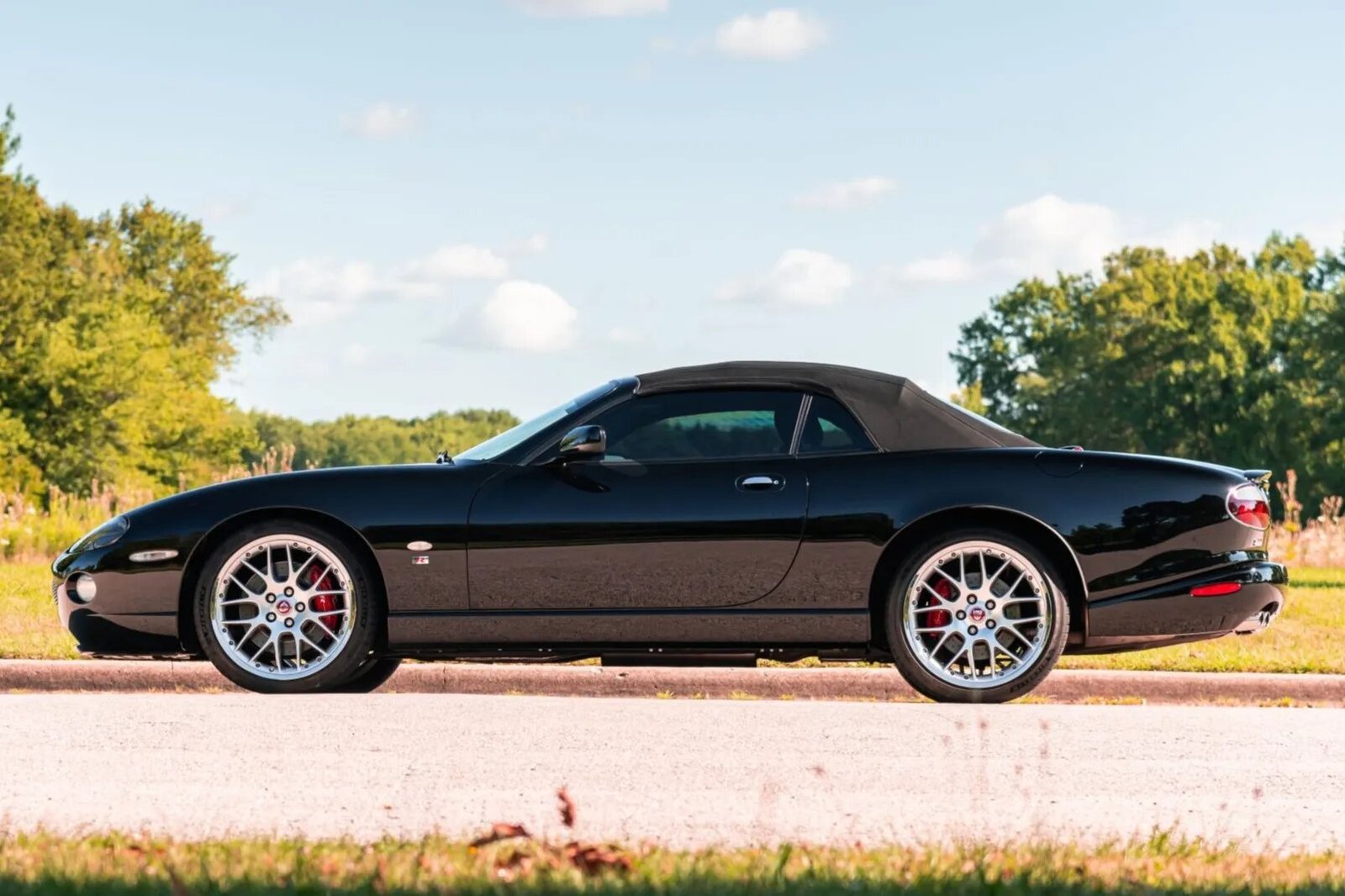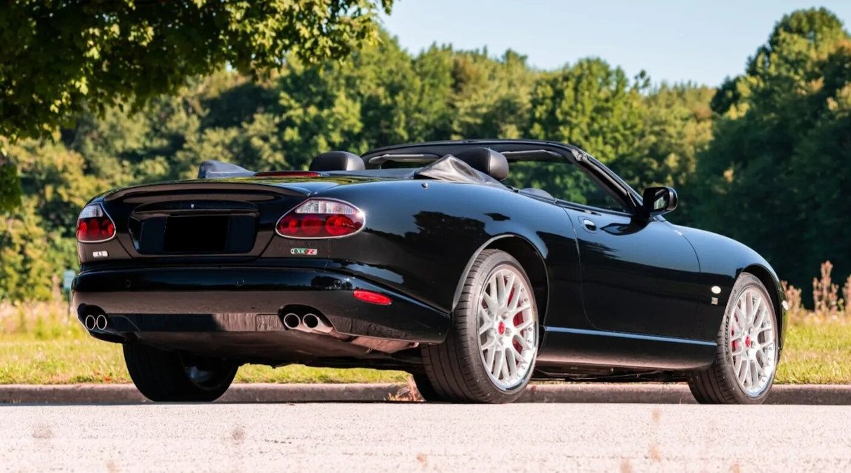 This 2006 Jaguar XKR Convertible is a Victory Limited Edition example has 72k miles. The car is finished in Ebony over Warm Charcoal leather upholstery, and power is provided by a supercharged 4.2-liter V8 paired with a six-speed ZF automatic transmission. Equipment includes a power-operated black soft top, Brembo brakes, Computer Active Technology Suspension, 20″ BBS two-piece wheels, power-adjustable and heated front seats, automatic climate control, a factory Alpine CD/cassette stereo, navigation, and carbon-fiber interior trim.