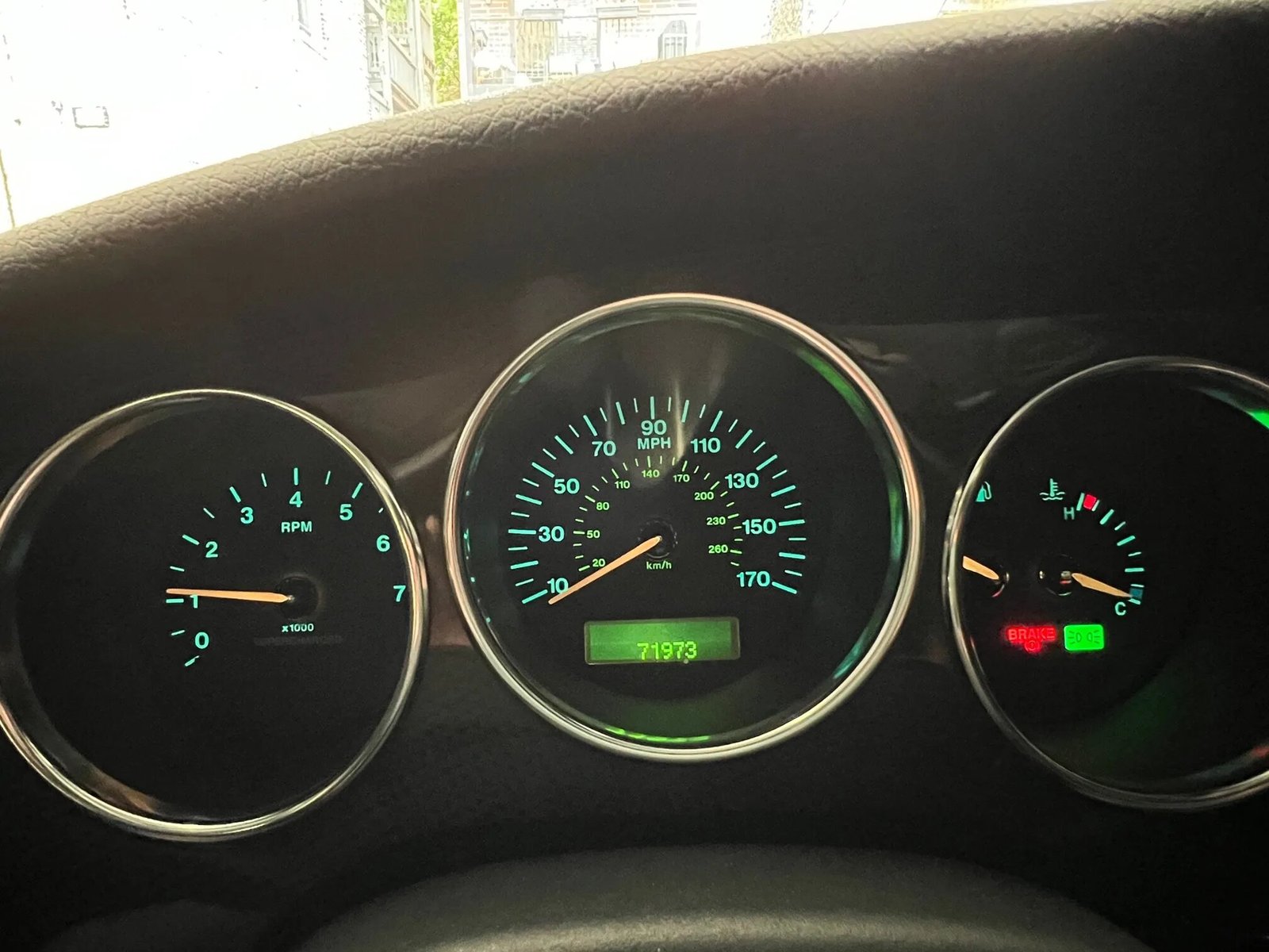 A leather-wrapped steering wheel frames a tachometer with a 6k-rpm redline and a 170-mph speedometer.